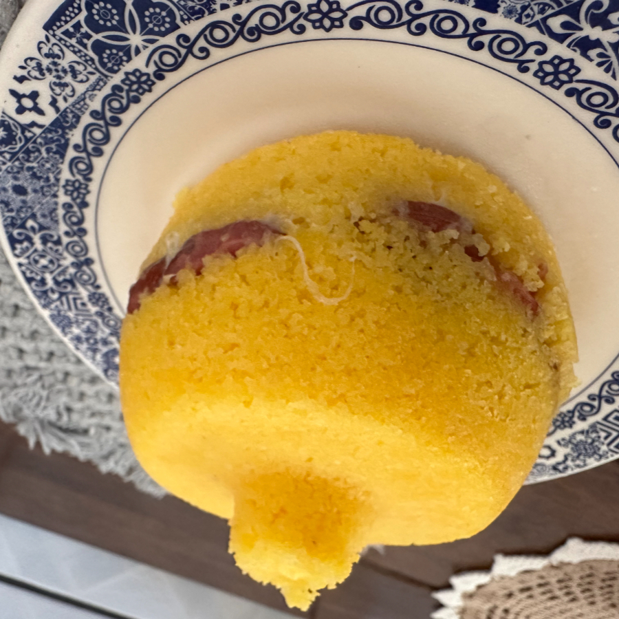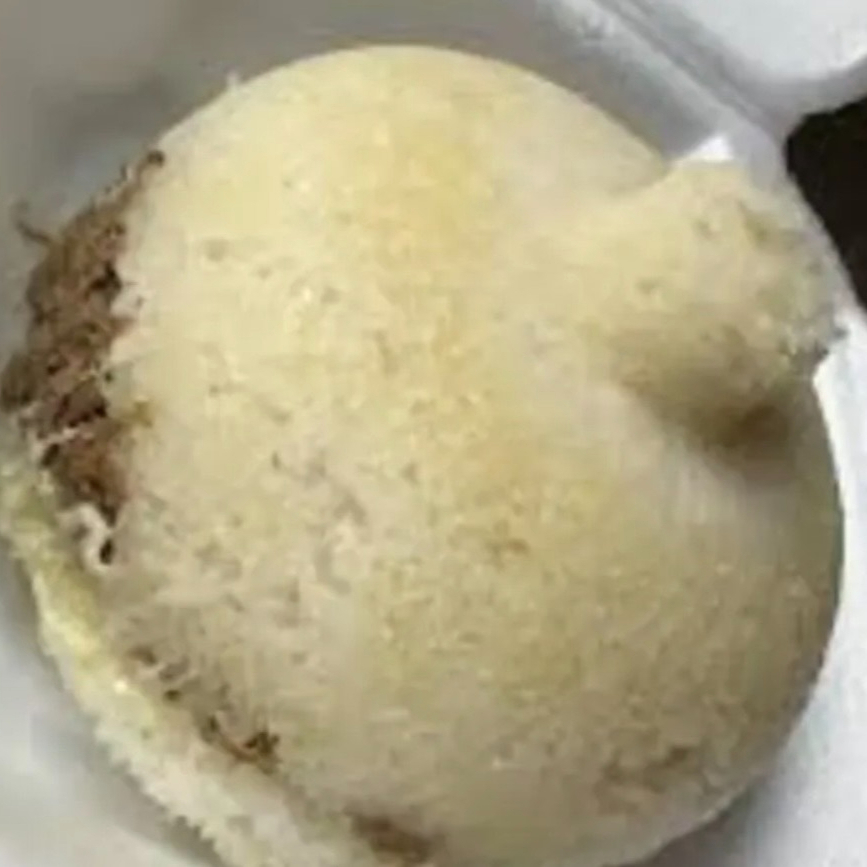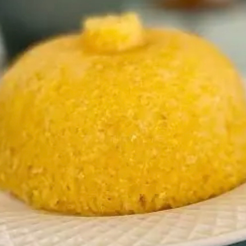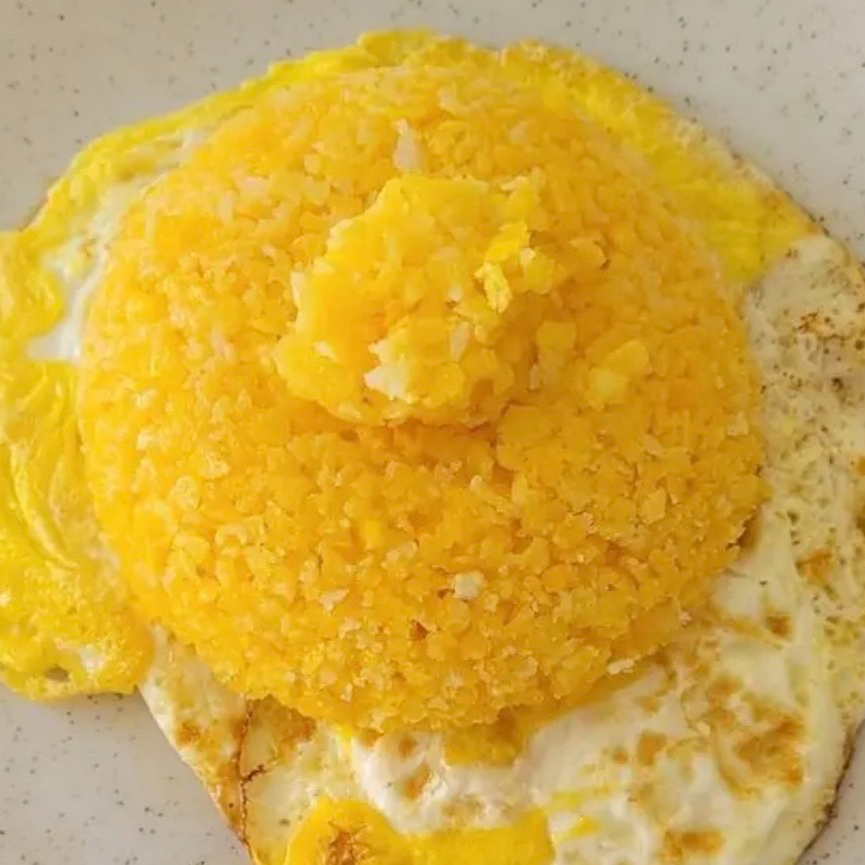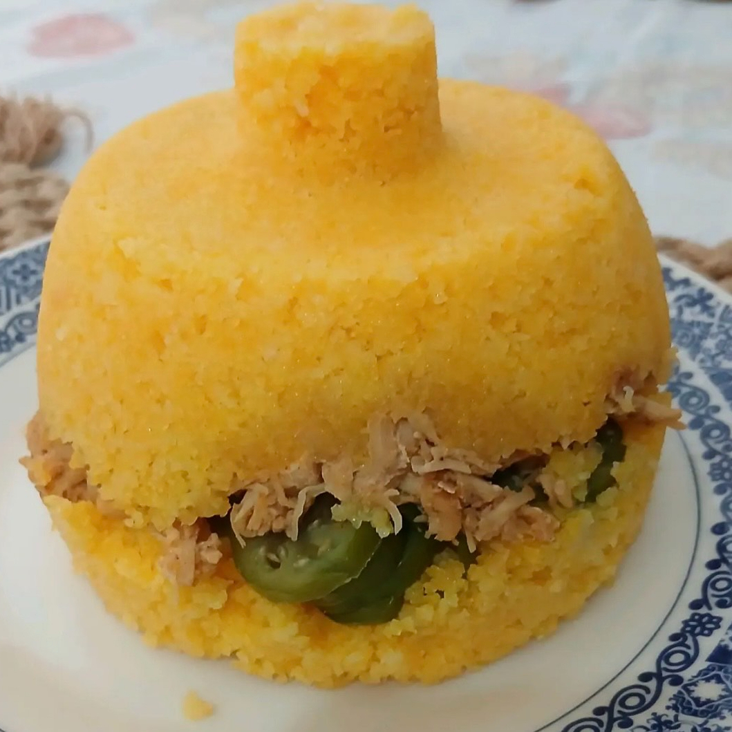 Cuscuz recheado com ovo frito e queijo mussarela.