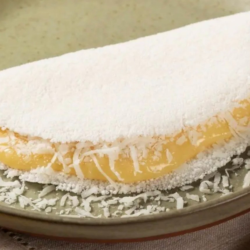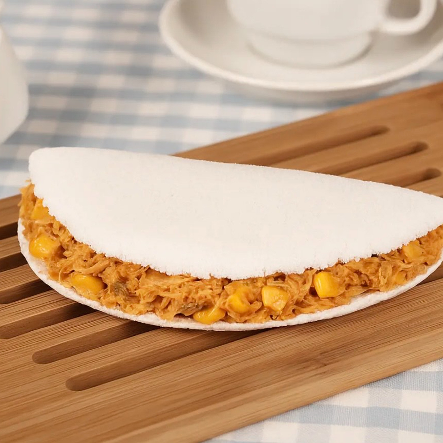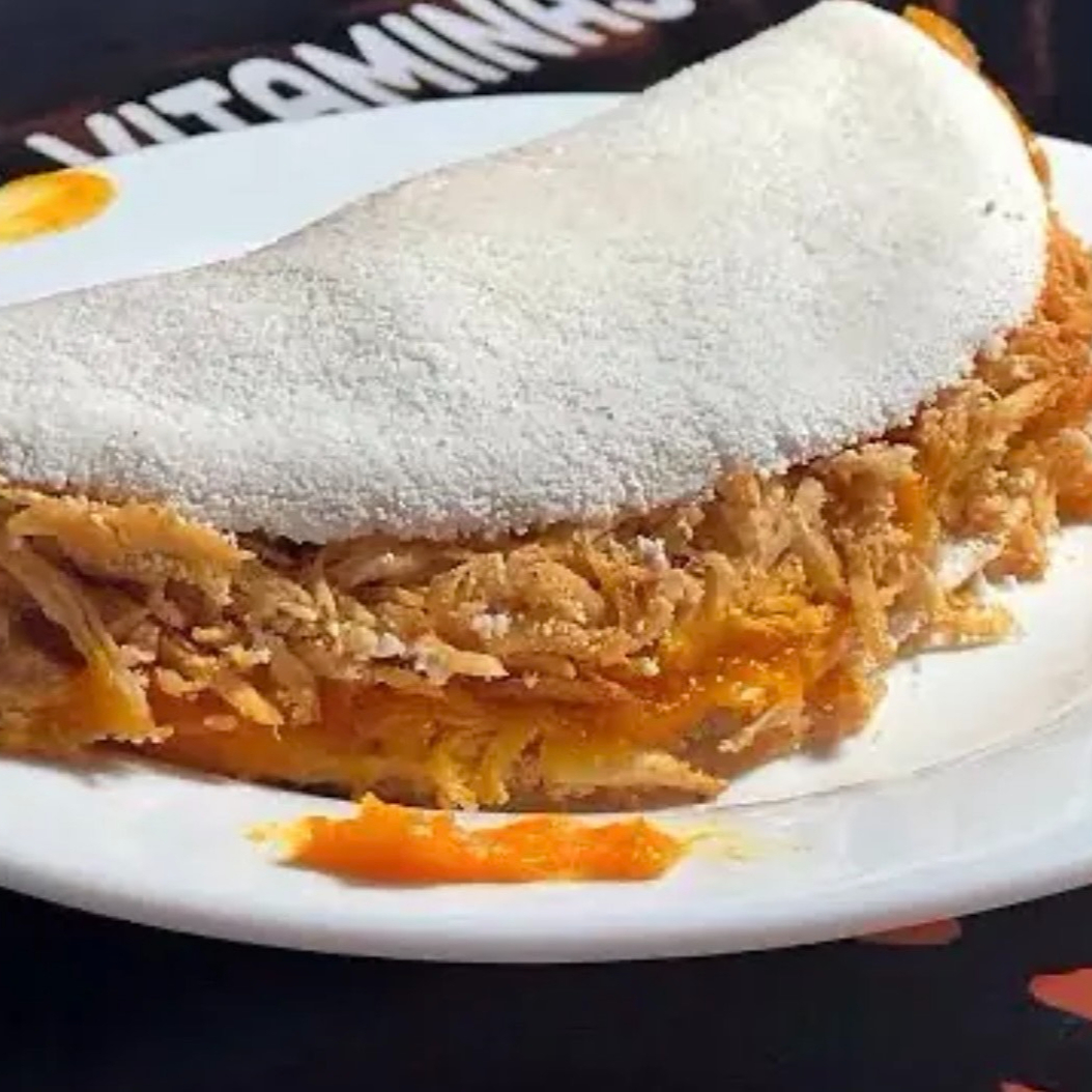 Tapioca recheada com frango artesanal desfiado, milho, catupiry e orégano
