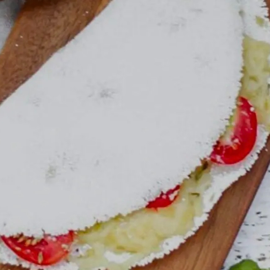 Tapioca recheada com fatias de calabresa, catupiry, queijo mussarela, tomates e orégano