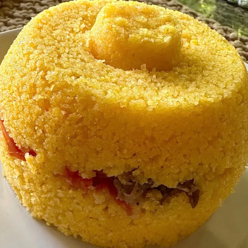 Cuscuz recheado com carne desfiada artesanal, jiló, tomate e catupiry