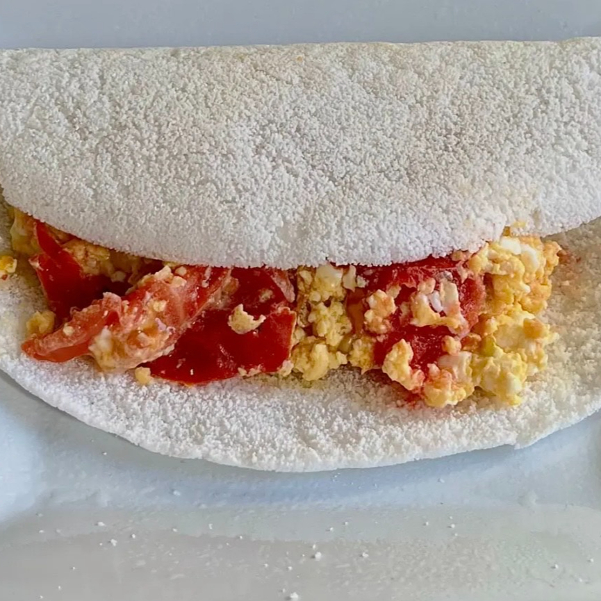 Tapioca recheada com dois ovos mexidos, tomates e orégano