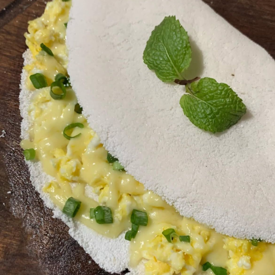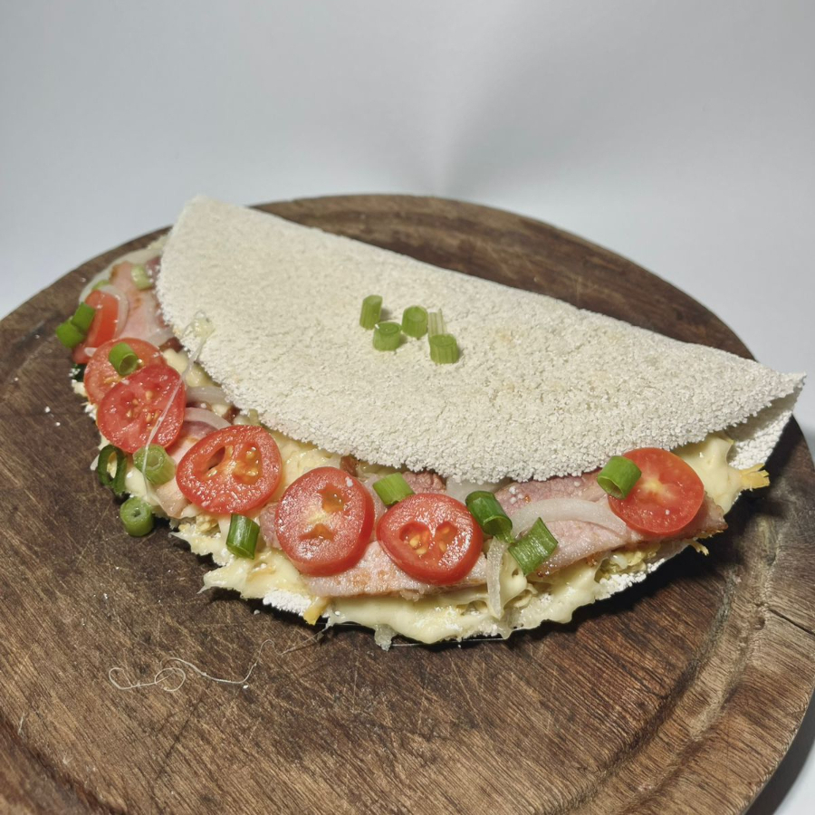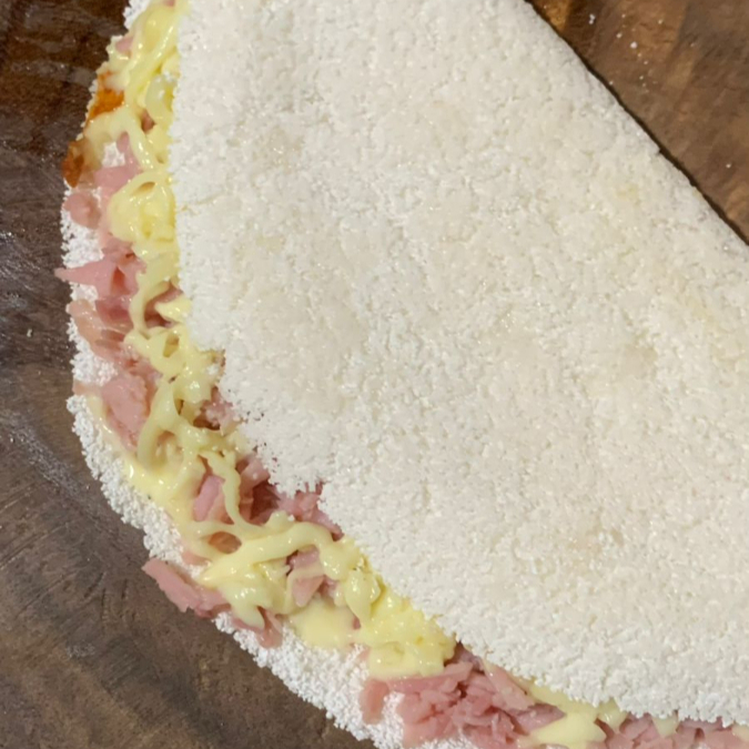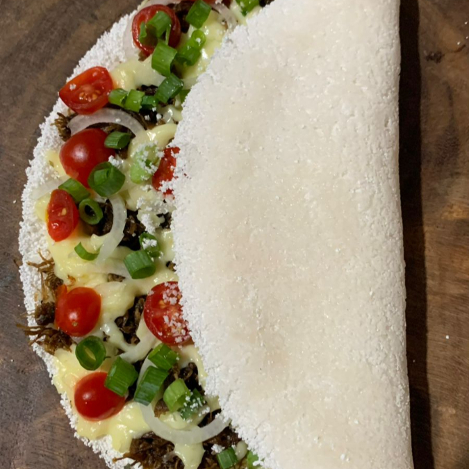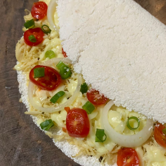 carne seca, queijo mussarela ralada, catupiry, cebola, tomate cereja e cheiro verde.