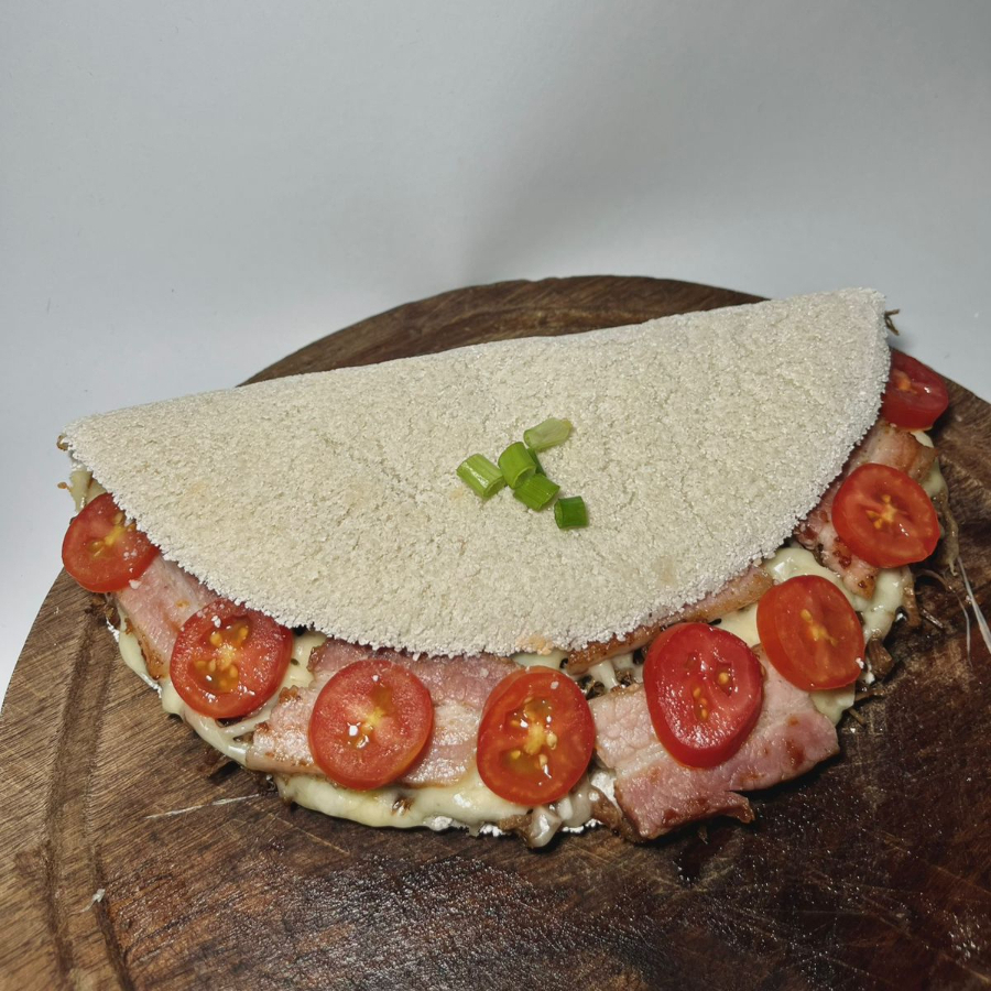 frango, catupiry, cebola, tomate cereja, queijo mussarela e bacon.