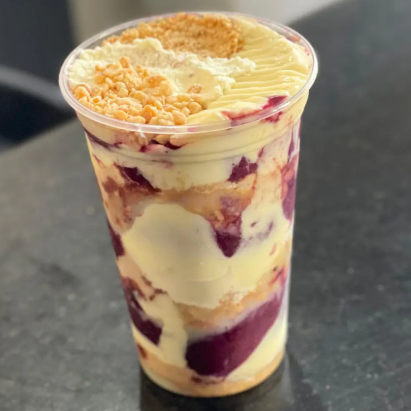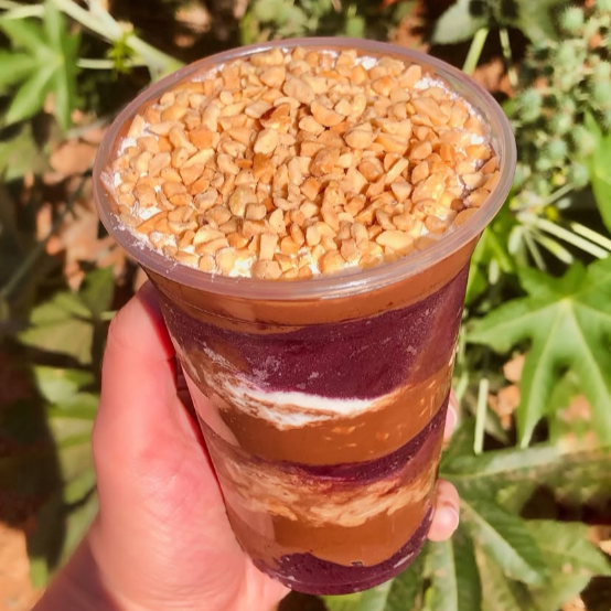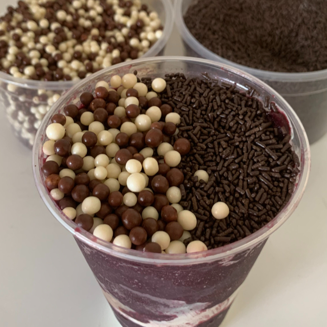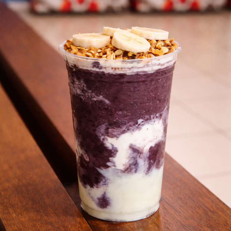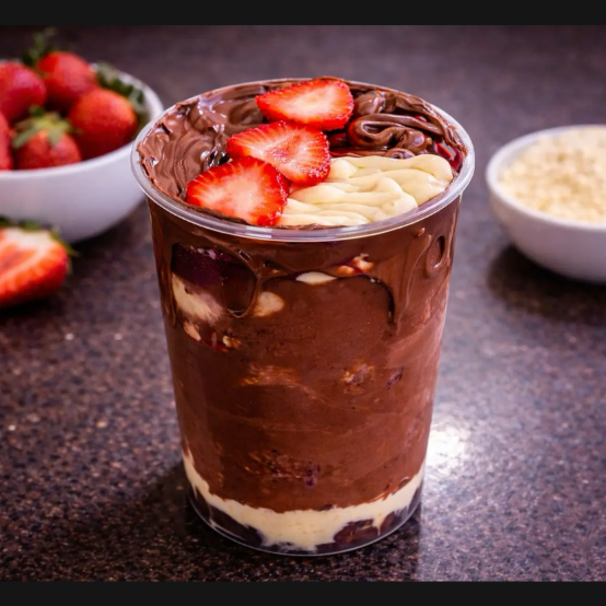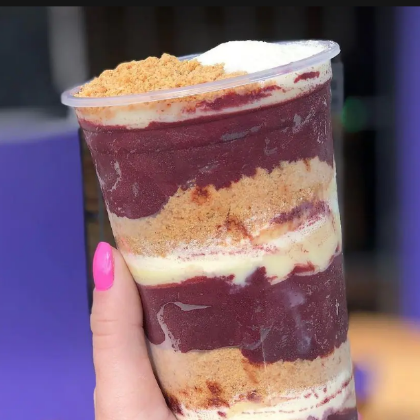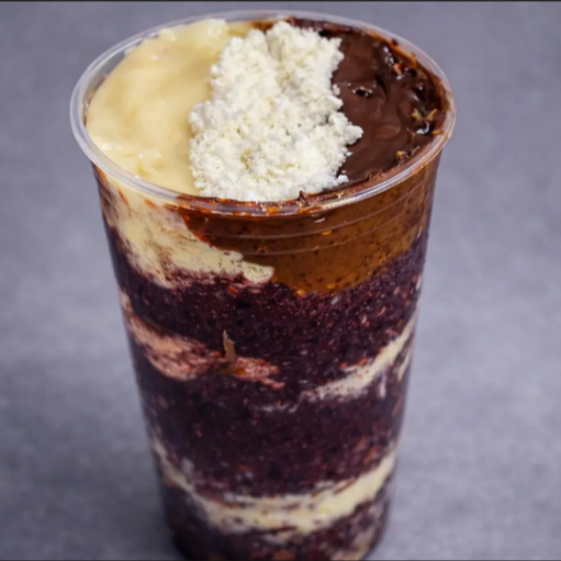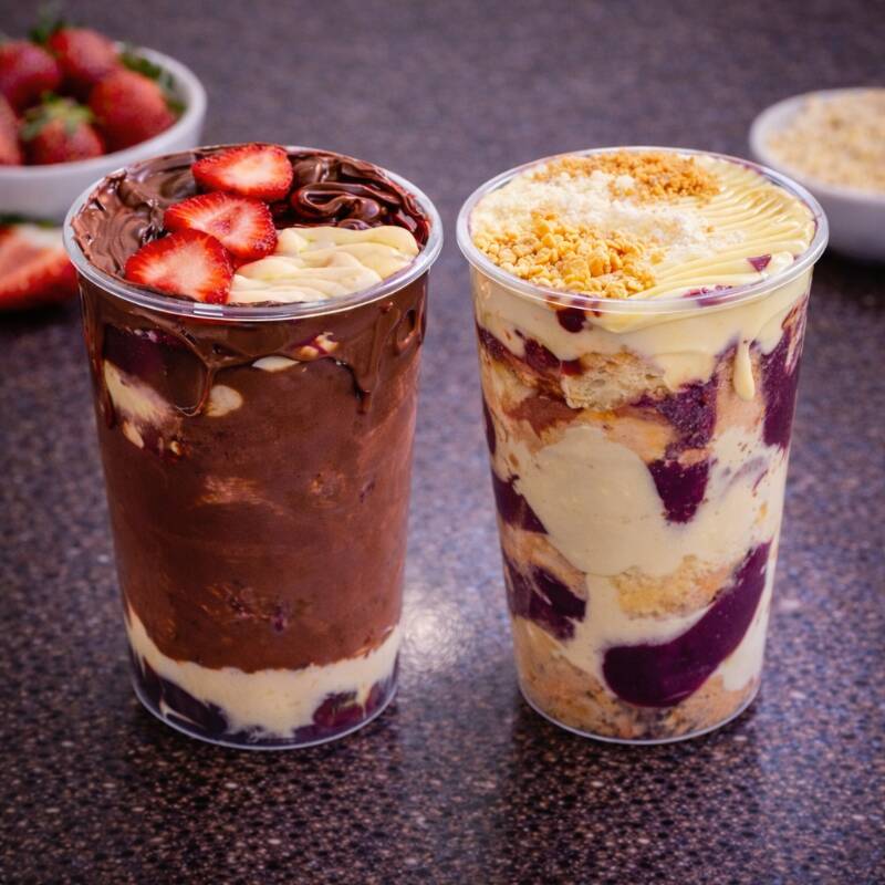 Camadas generosas de açaí cremoso, muito creme de Ninho, creme de avelã, granola crocante, leite em pó e leite condensado.