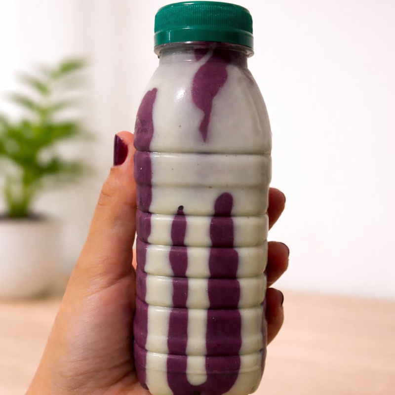 Açaí batido com leite, leite condensado e leite em pó, com muuuuito creme de ninho e finalizado com leite em pó.