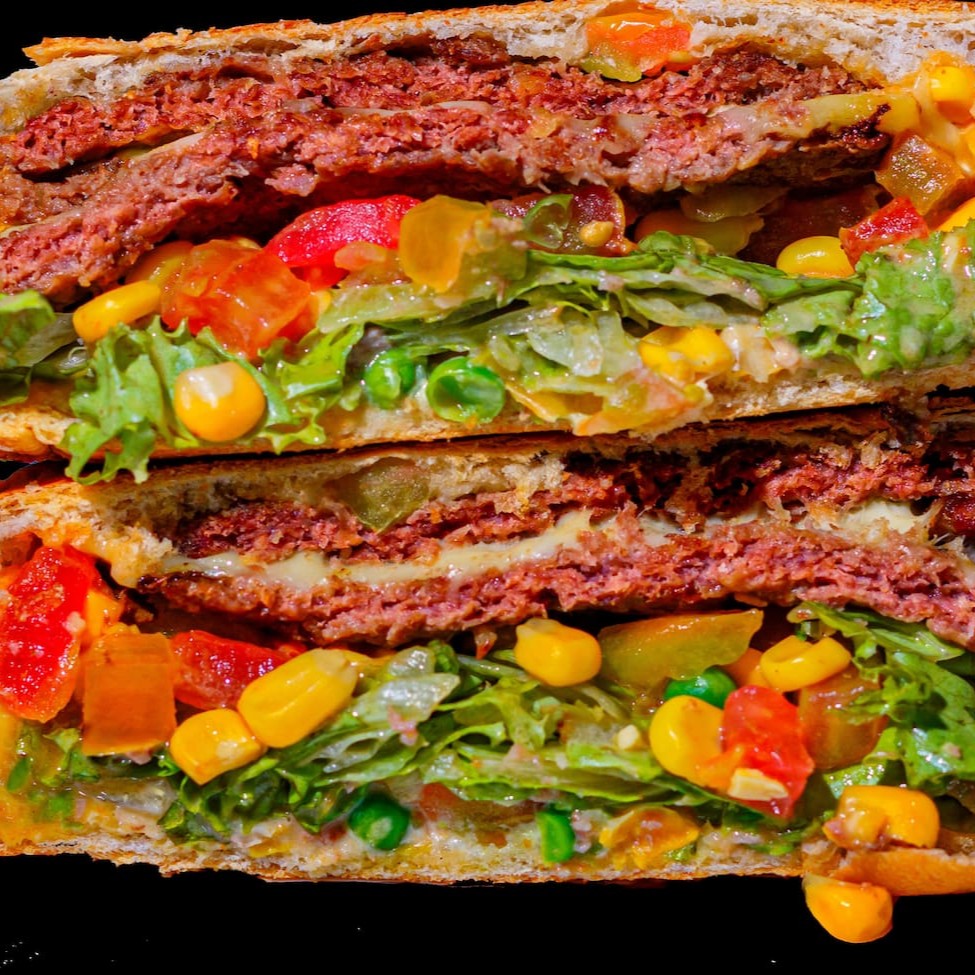 Pão fabricação própria, ketchup, mostarda e maionese tchê, 2 Hambúrgueres Angus cobertos por mussarela derretida, finalizado com ervilha fresca, milho, alface e tomate.