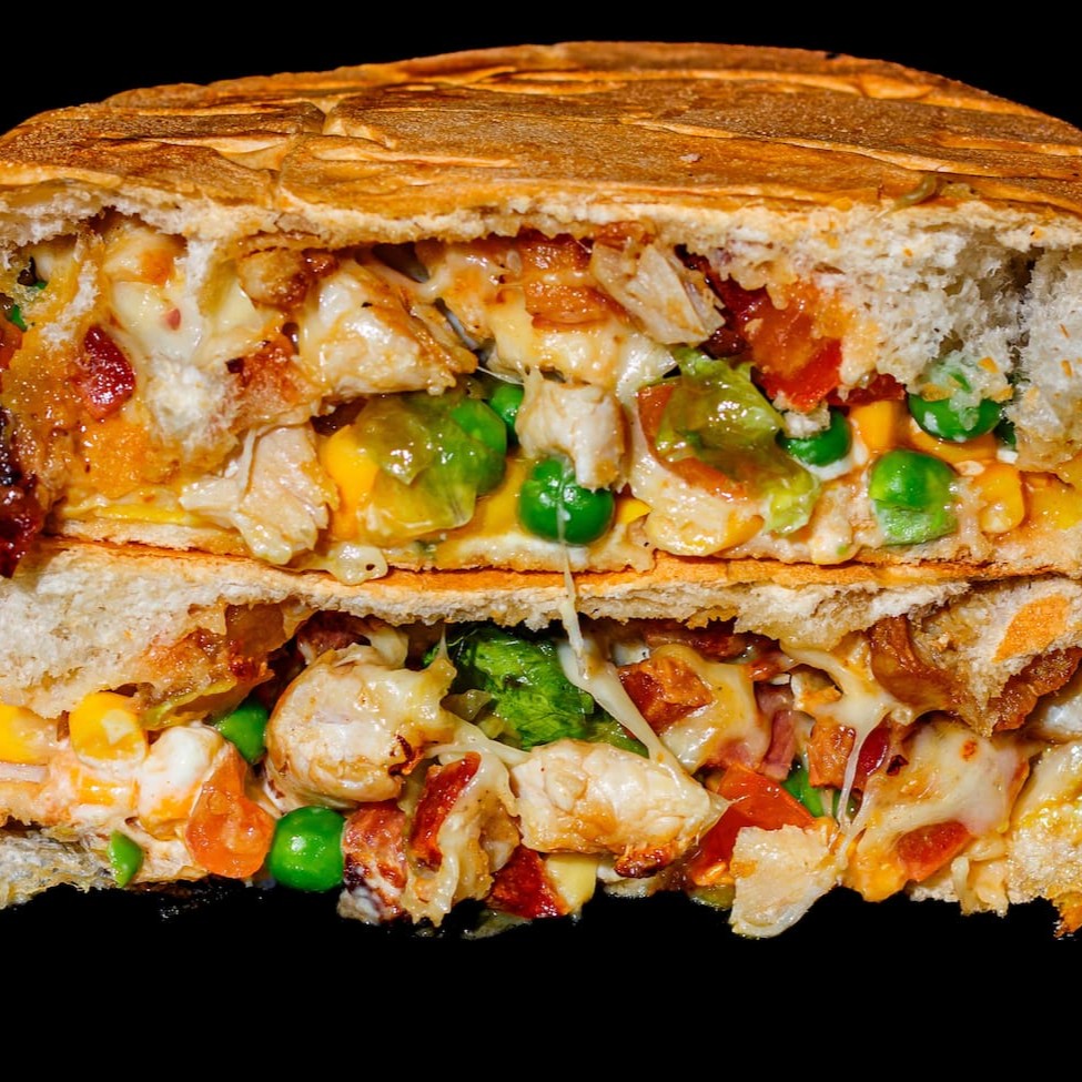Pão fabricação própria, ketchup, mostarda e maionese tchê, Filé de Frango, bacon fritinho, coberto por mussarela derretida, finalizado com ervilha fresca, milho, alface e tomate.