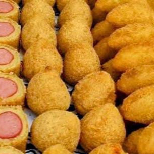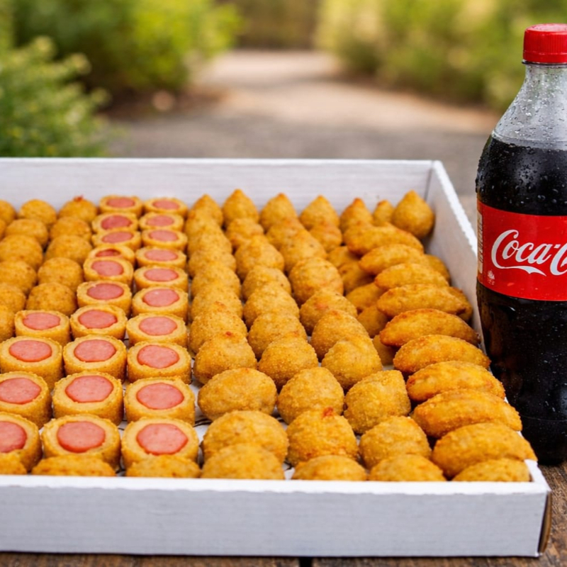 bolinha de queijo , pastel de carne , enrolado de salsicha, coxinha e croquete de presunto e queijo.