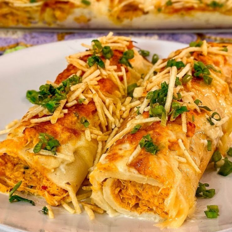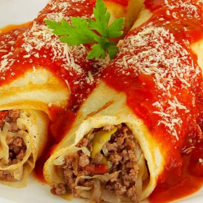 deliciosa panqueca recheada com frango, queijo e molho de tomate