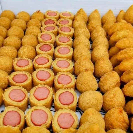 coxinha , pastel de carne , bolinha de queijo , enrolado de salsicha e croquete de presunto e queijo.