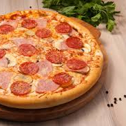 Molho, mussarela, apresuntado, bacon, cebola, tomate, azeitona e orégano obs.: imagem ilustrativa