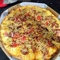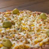Molho, mussarela, frango, cheddar, batata palha, azeitona e orégano obs.:imagem ilustrativa
