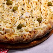 Molho, mussarela, frango, catupiry, azeitona e orégano obs.: imagem ilustrativa