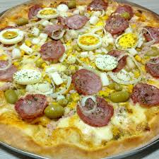 Molho, mussarela, presunto, calabresa, ovo, cebola, ervilha, azeitona e orégano obs.: imagem ilustrativ