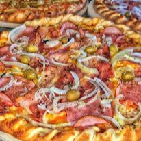 Molho, mussarela, calabresa, lombinho, cebola, azeitona e orégano obs.: imagem ilustrativa