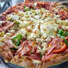 Molho, mussarela, presunto, frango, calabresa, ovo, bacon, milho, ervilha, azeitona e orégano obs.: imagem ilustrativa