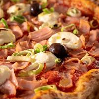 Molho, mussarela, bacon, lombinho, cebola, tomate, azeitona e orégano obs.: imagem ilustrativa
