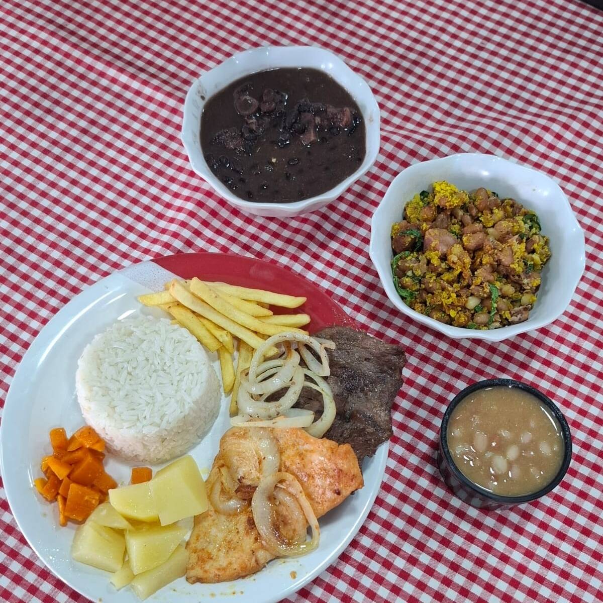 Arroz branco, feijão de caldo, macarrão, carne do dia, legumes, farofa e salada.