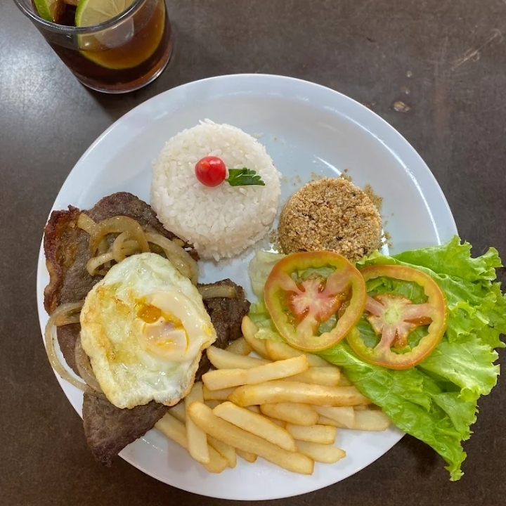 Bife, arroz, feijão de caldo, batata frita, legumes, farofa e salada.
