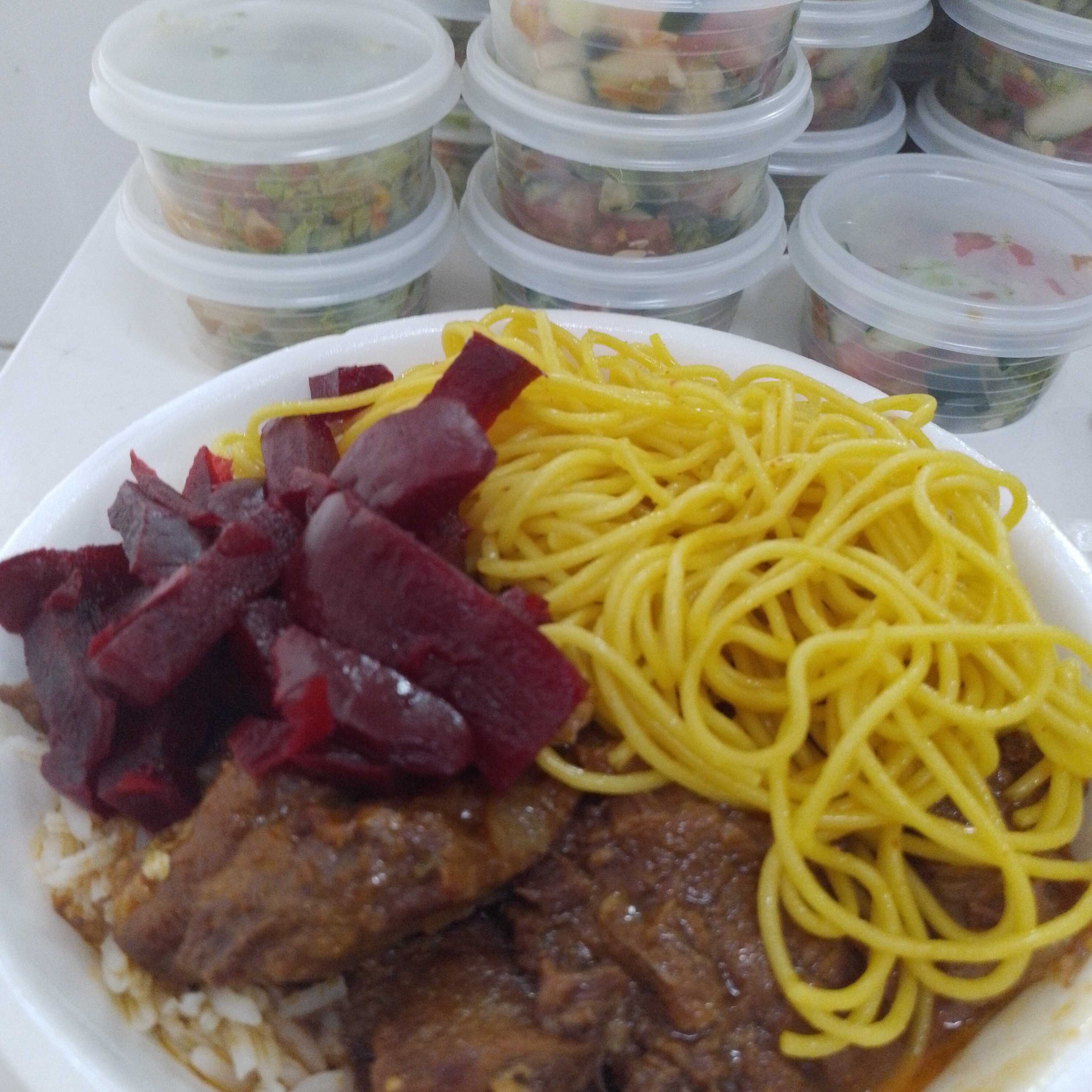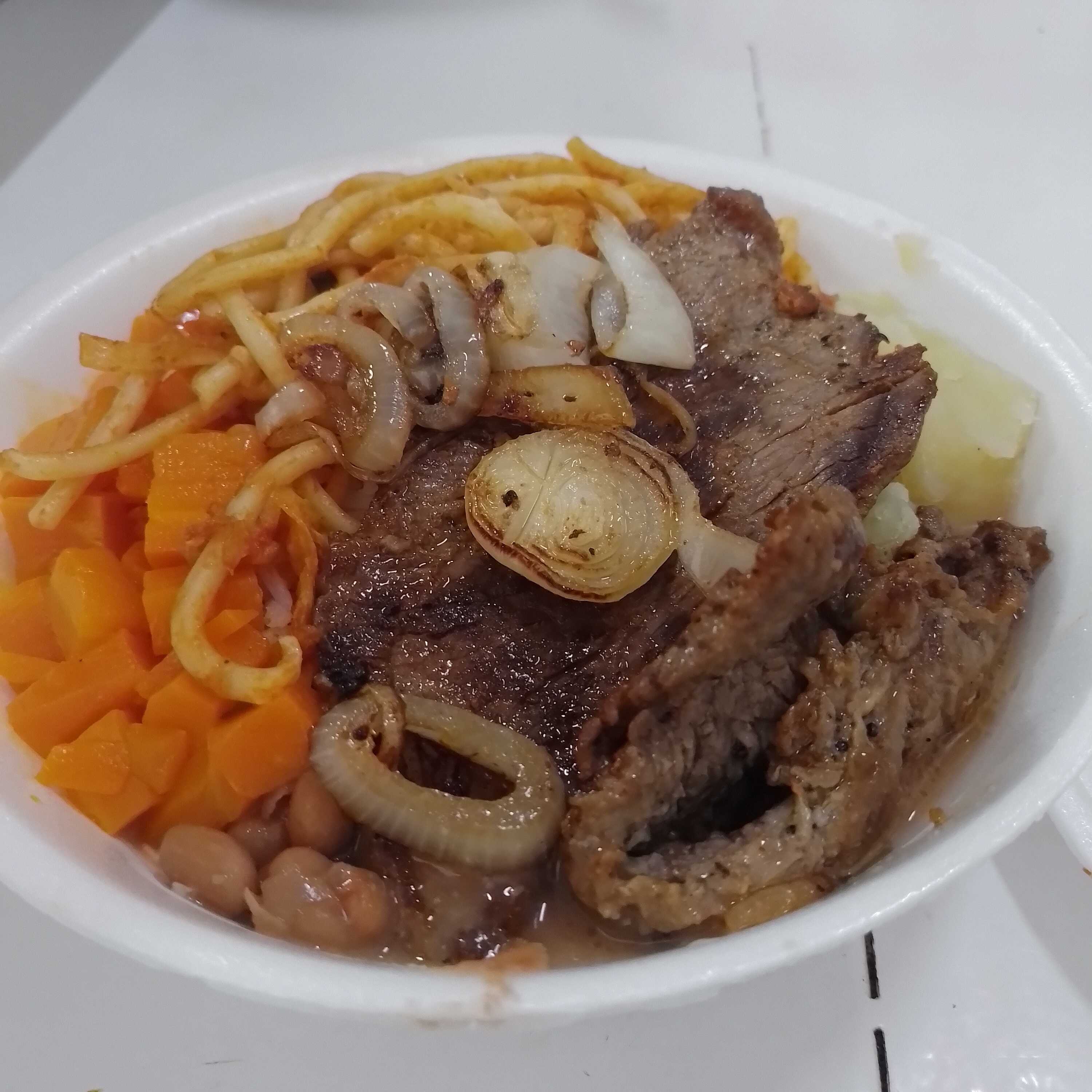 arroz, macarrao ,feijao caldo, bife bovino legume do dia