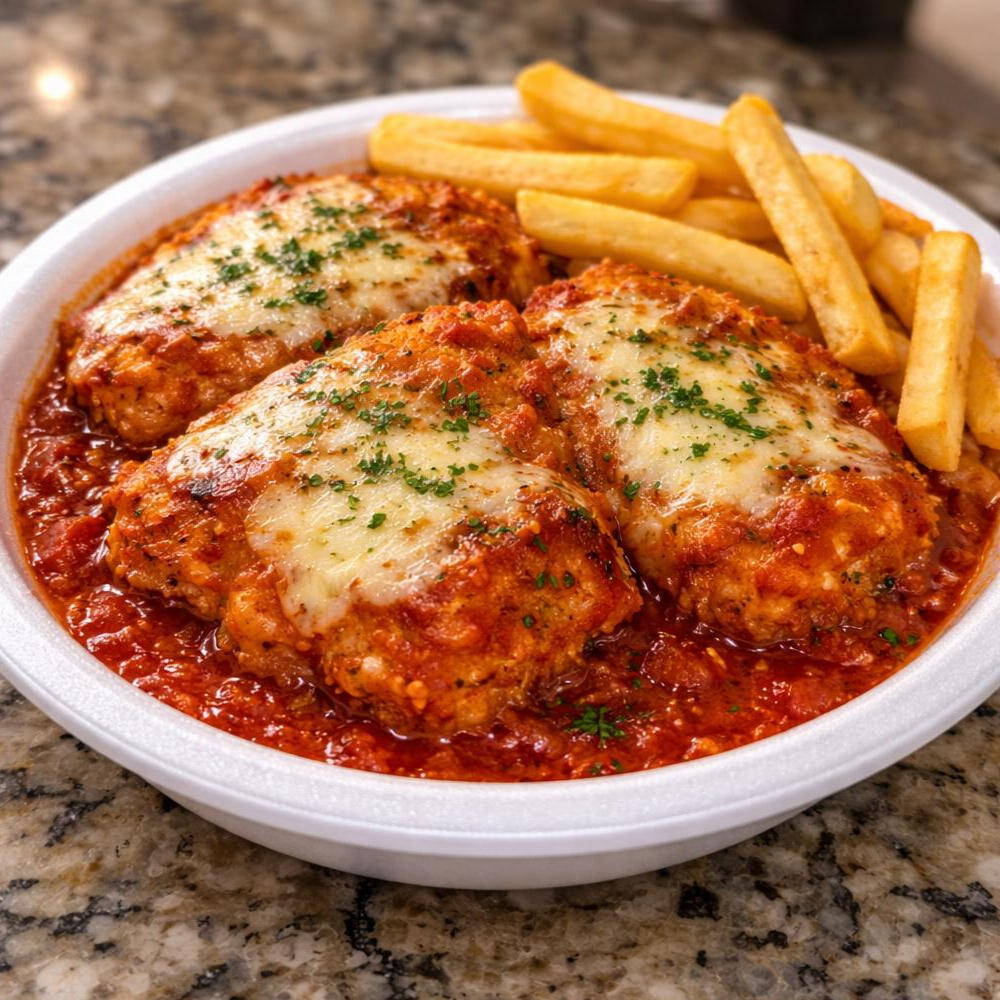 Carolina, nossa cliente, pediu parmegiana. Nós atendemos - e todos ganham! File de frango crocante, com molho de tomate da casa e queijo gratinado ao forno. Acompanha arroz branco, fritas e salada!