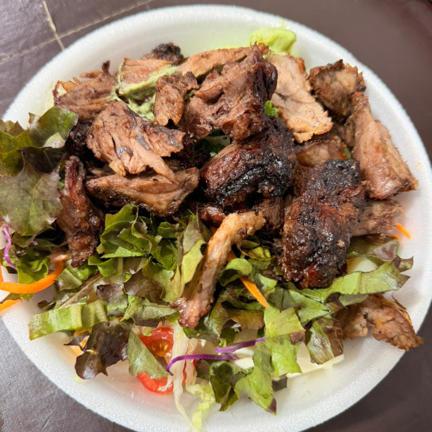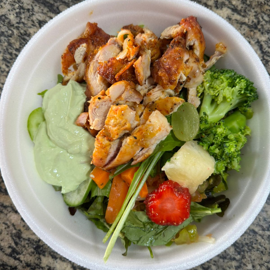 Salada completa com folhas frescas, legumes cozidos e carne. Molho verde da casa opcional.