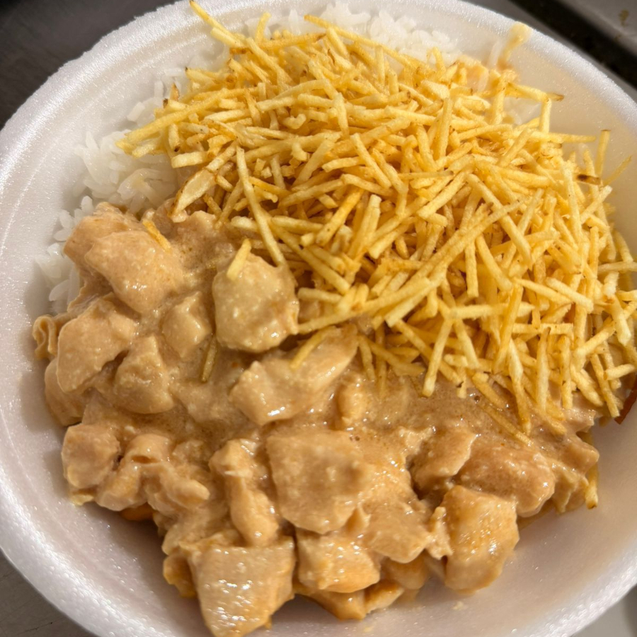 Strogonoff de Frango cremoso, tempero caseiro e aquele sabor que abraça! Acompanha arroz fresquinho e batata palha crocante