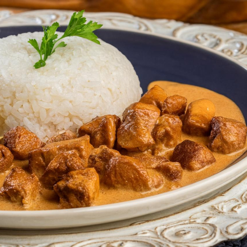 Strogonoff de Carne cremoso, tempero caseiro e aquele sabor que abraça! Acompanha arroz fresquinho e batata palha crocante
