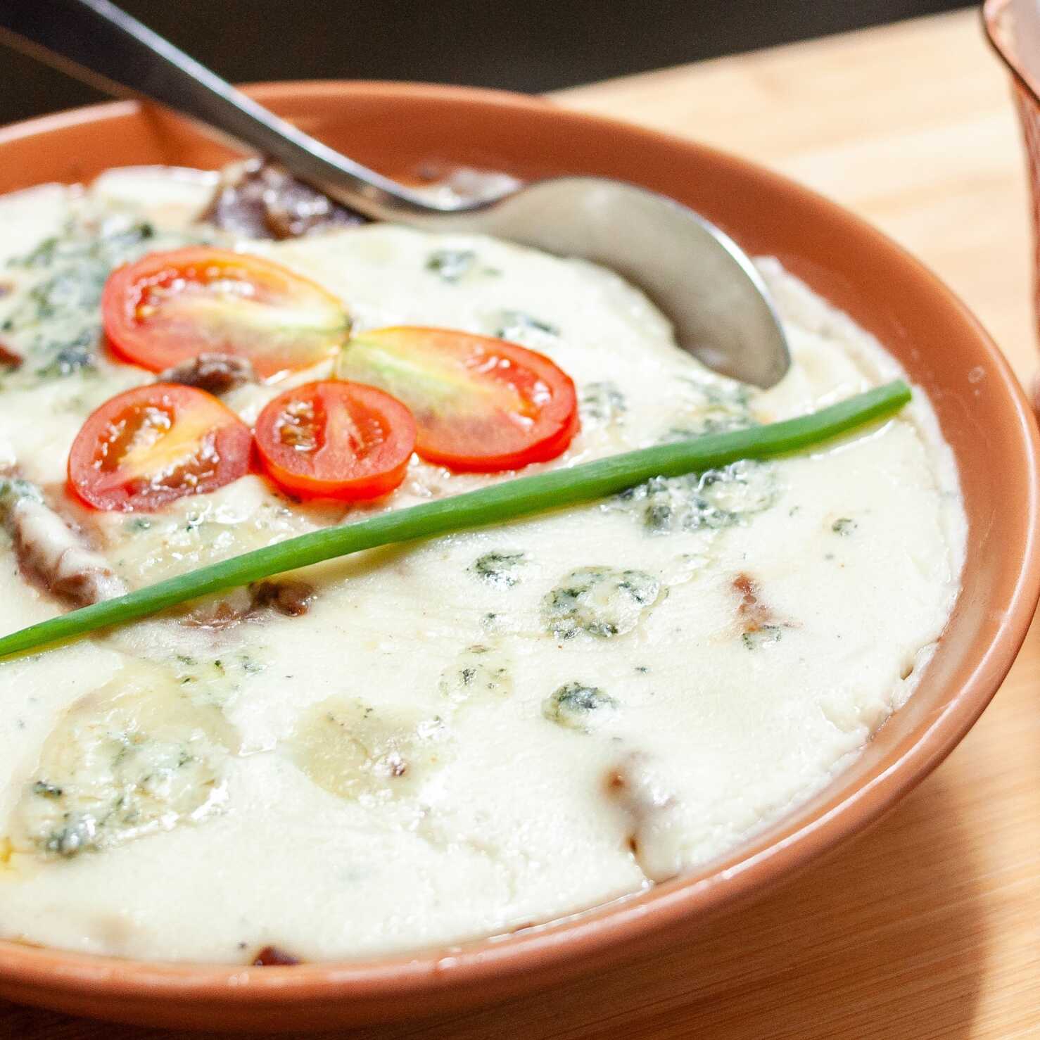 Massa talharim ao molho de gorgonzola, filé mignon ao molho roty com champignon.