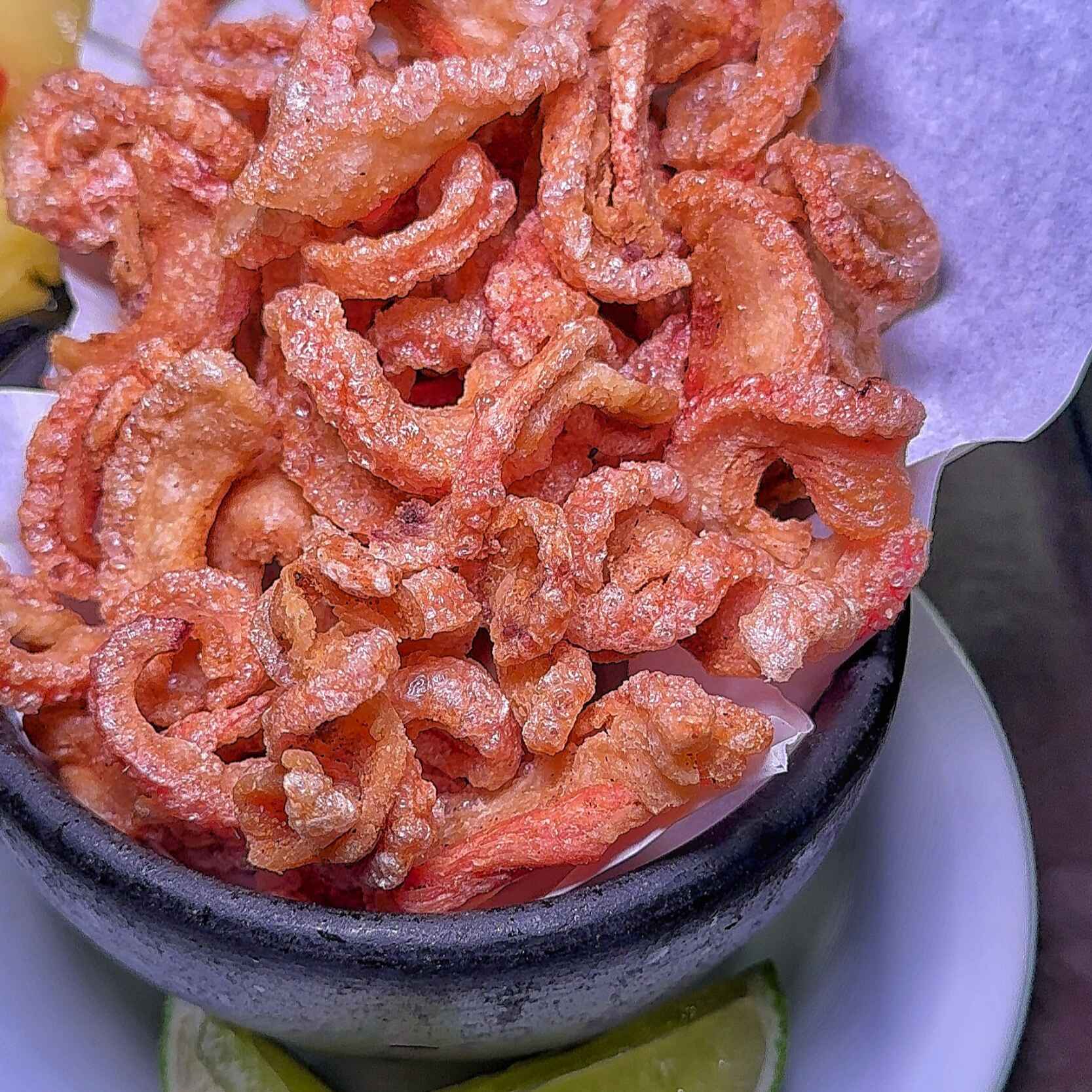 Tiras crocantes de toucinho caipira servido com limão.