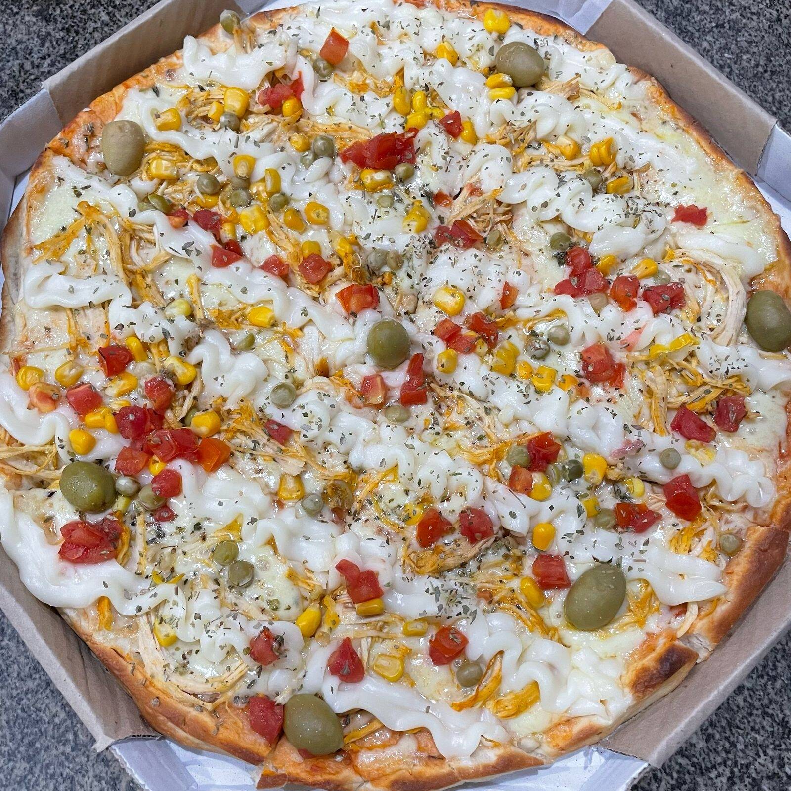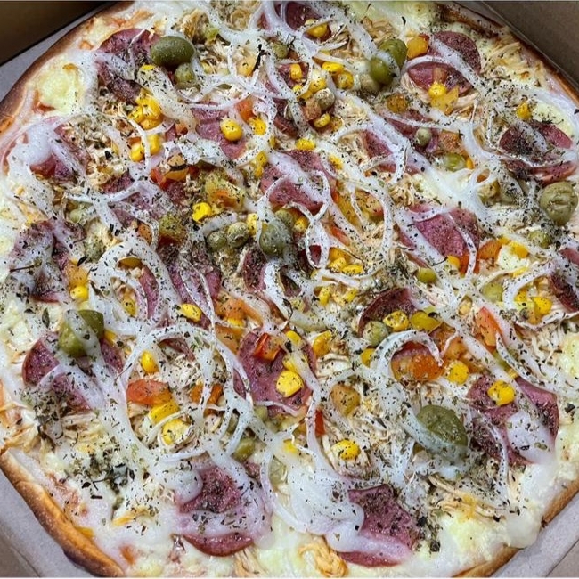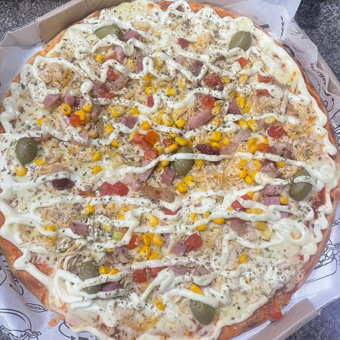 Molho, mussarela, frango, calabresa, catupiry, milho, ervilha,azeitona, cebola, tomate, óregano.
