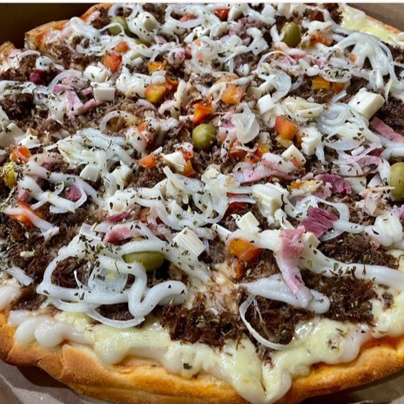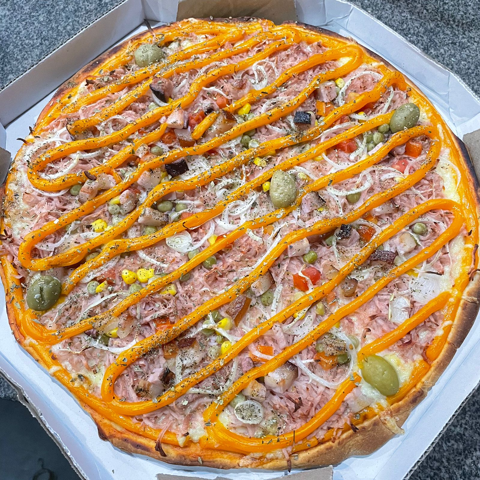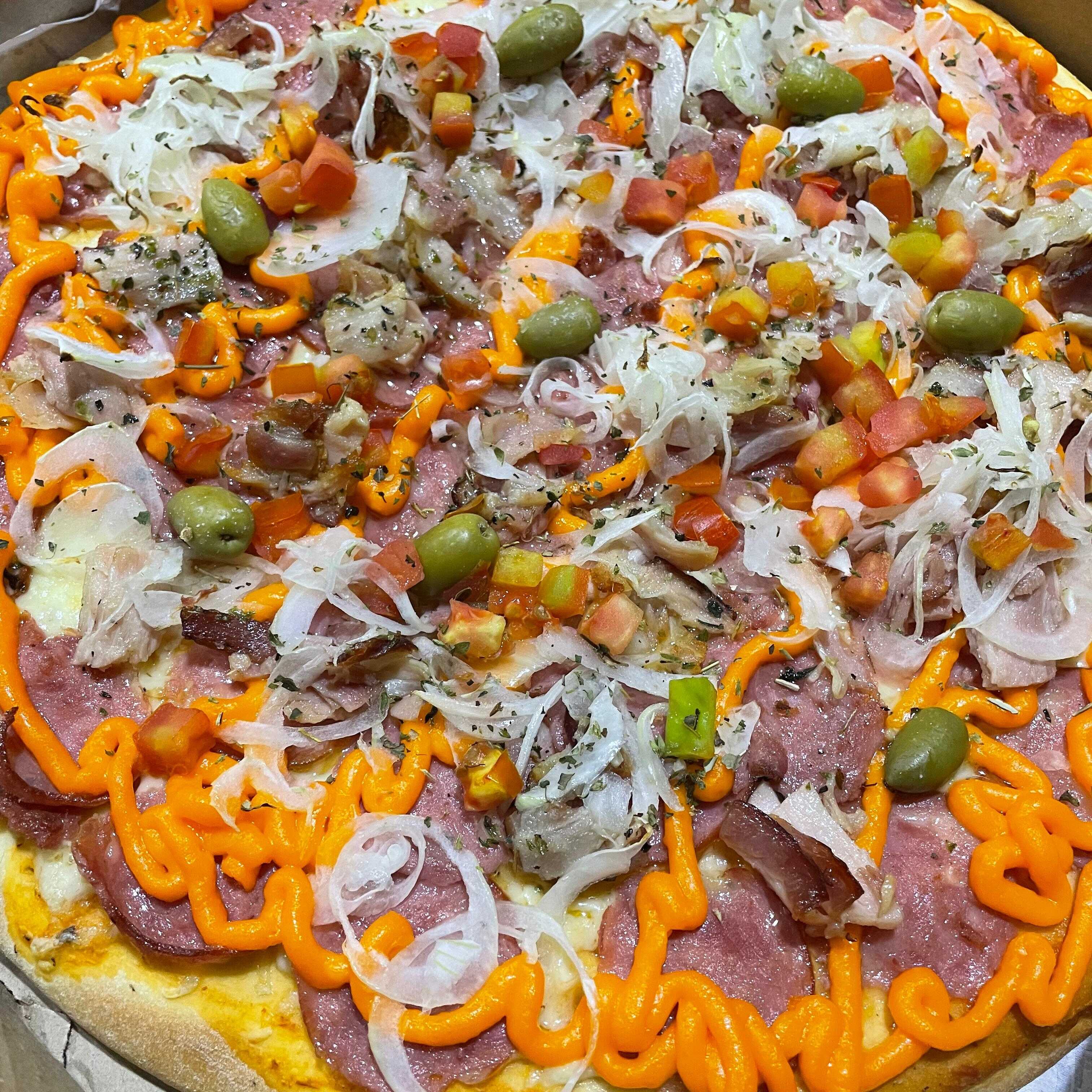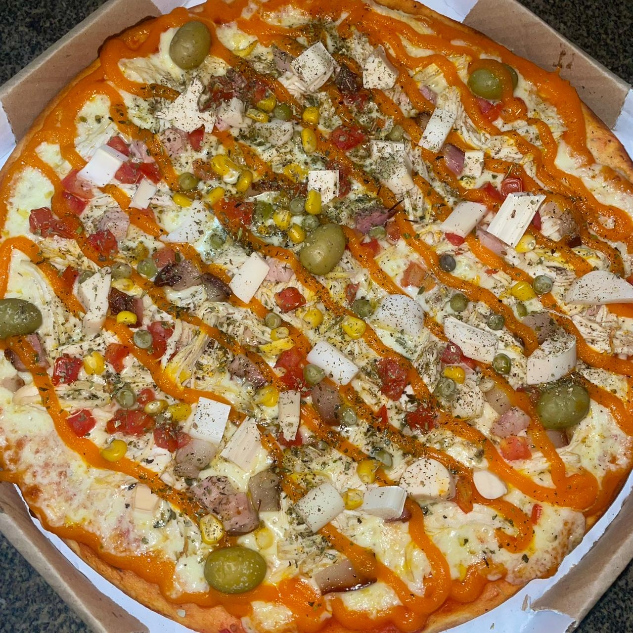 Molho, mussarela, frango, calabresa, catupiry, milho, ervilha,azeitona, cebola, tomate, óregano.