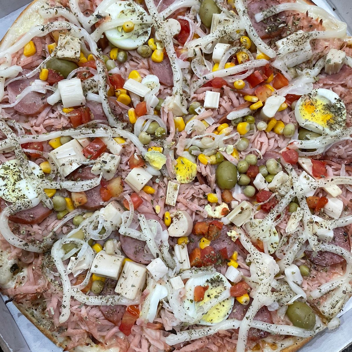 Molho, mussarela, presunto, milho, ervilha, palmito, calabresa,ovo,azeitona, cebola, tomate, óregano.