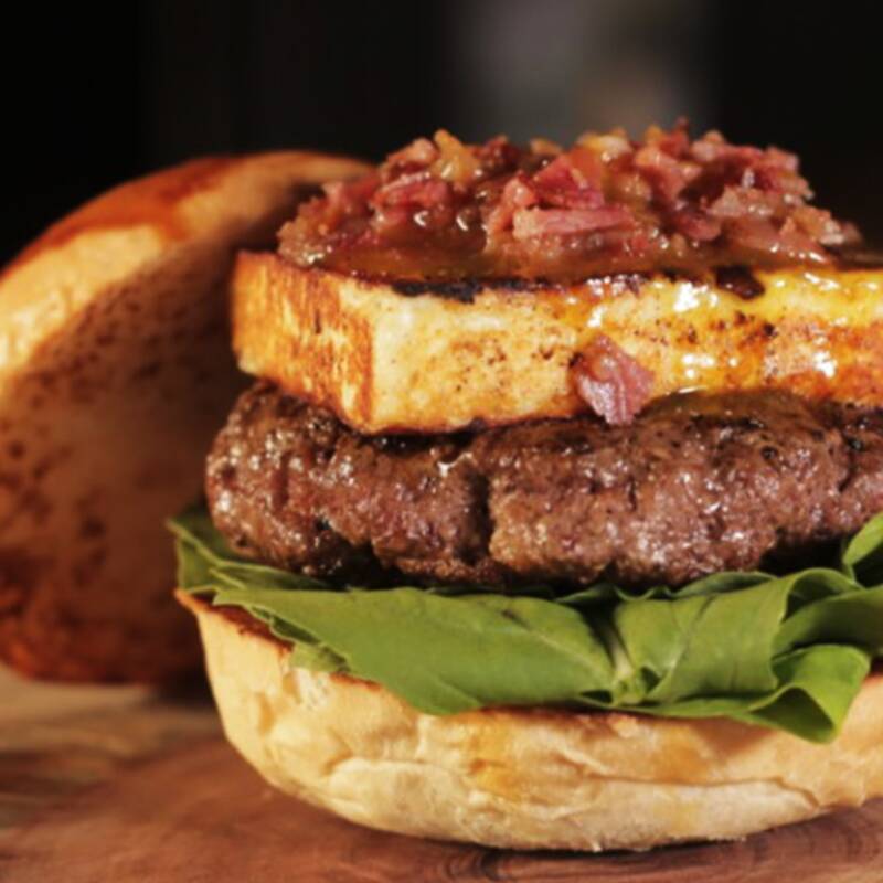 Hambúrguer 200g Recheado com Muçarela, Cebola Caramelizada no Mel, Bacon Granulado, Mais Muçarela, Alface Crocante, Tomate e Molho Português. Um Burguer Suculento com Vários Sabores.