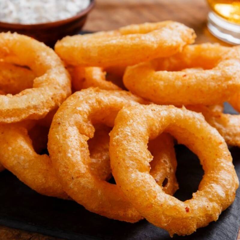 Cebola Crocante Empanada 300g, Servida com Molho Verde Especial da Casa. Um Petisco Perfeito para Acompanhar e Compartilhar.