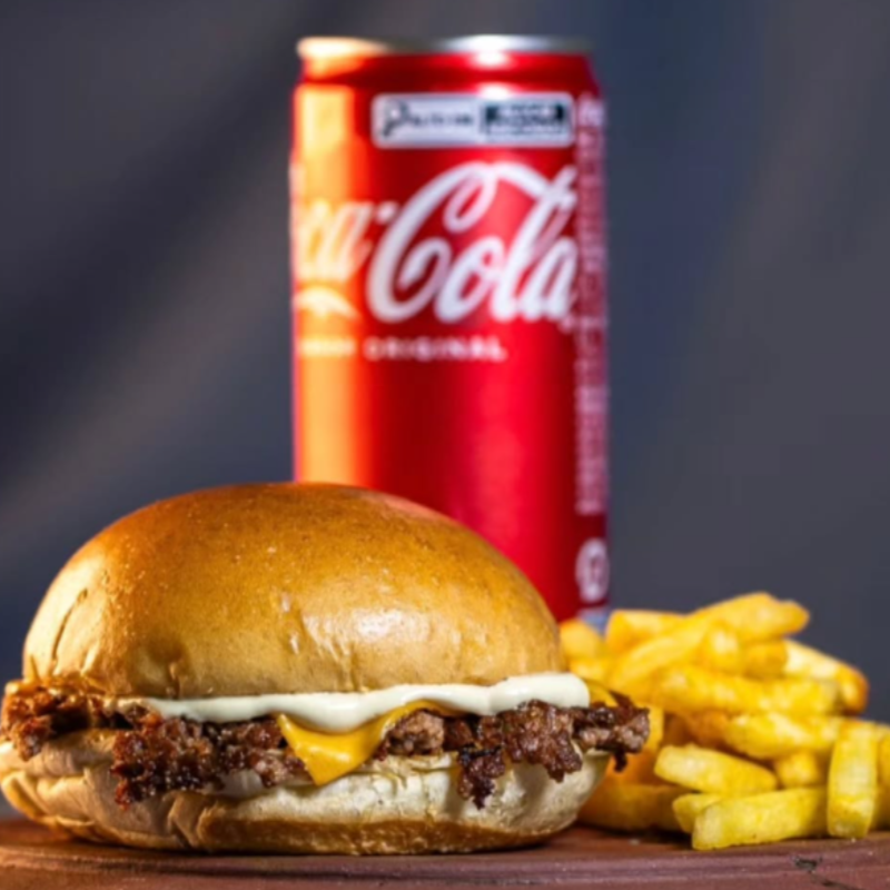 Hambúrguer Smash 100g Suculento com Cheddar Cremoso e Molho Especial da Casa e Coca Lata 350ml.
