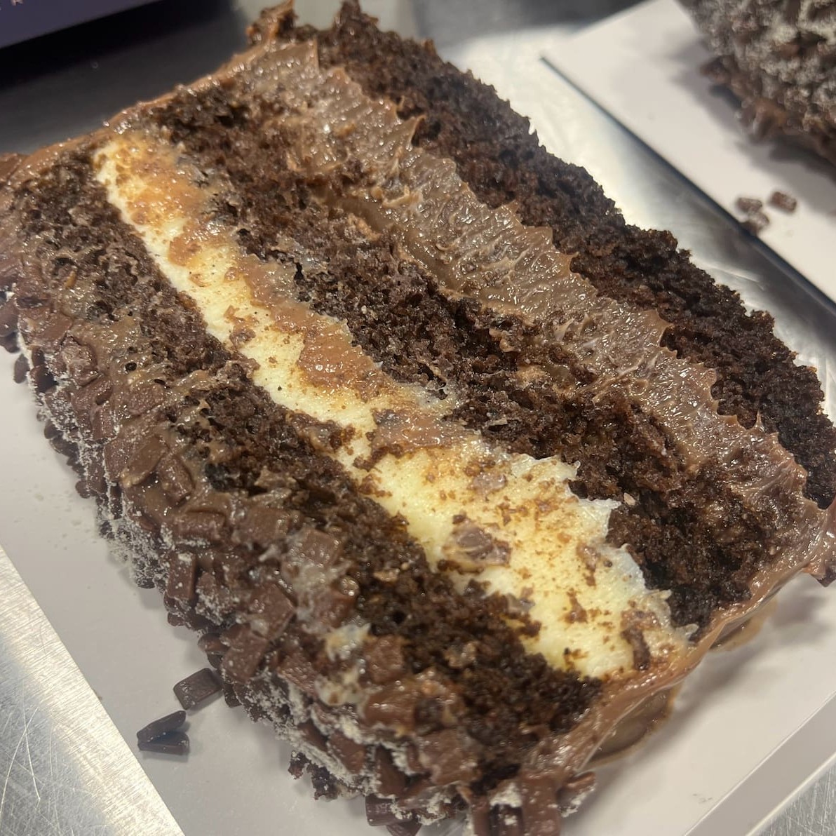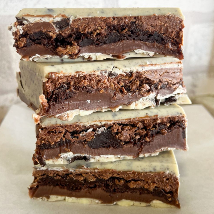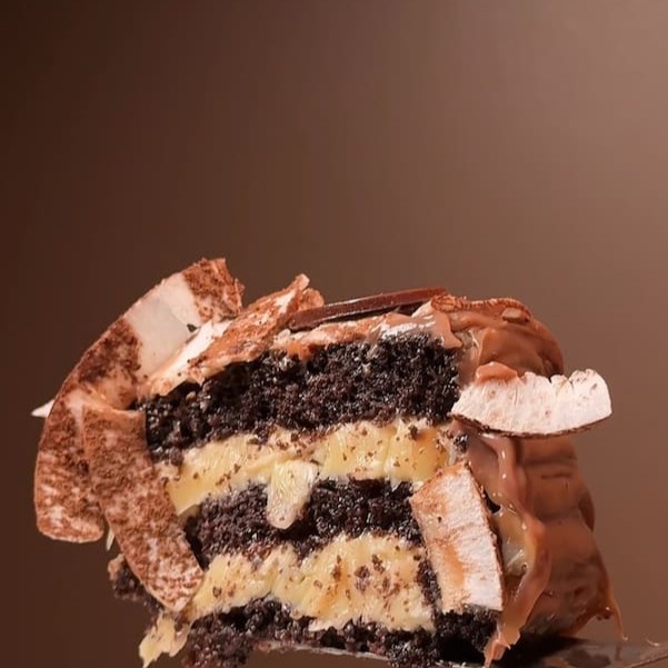 1 pedaço de barra de chocolate branco, oreo, brigadeiro de panela, massa densa de cacau e nutella crocante.