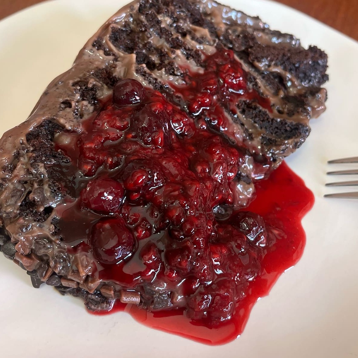 Massa de cacau, brigadeiro de panela e calda de frutas vermelhas.