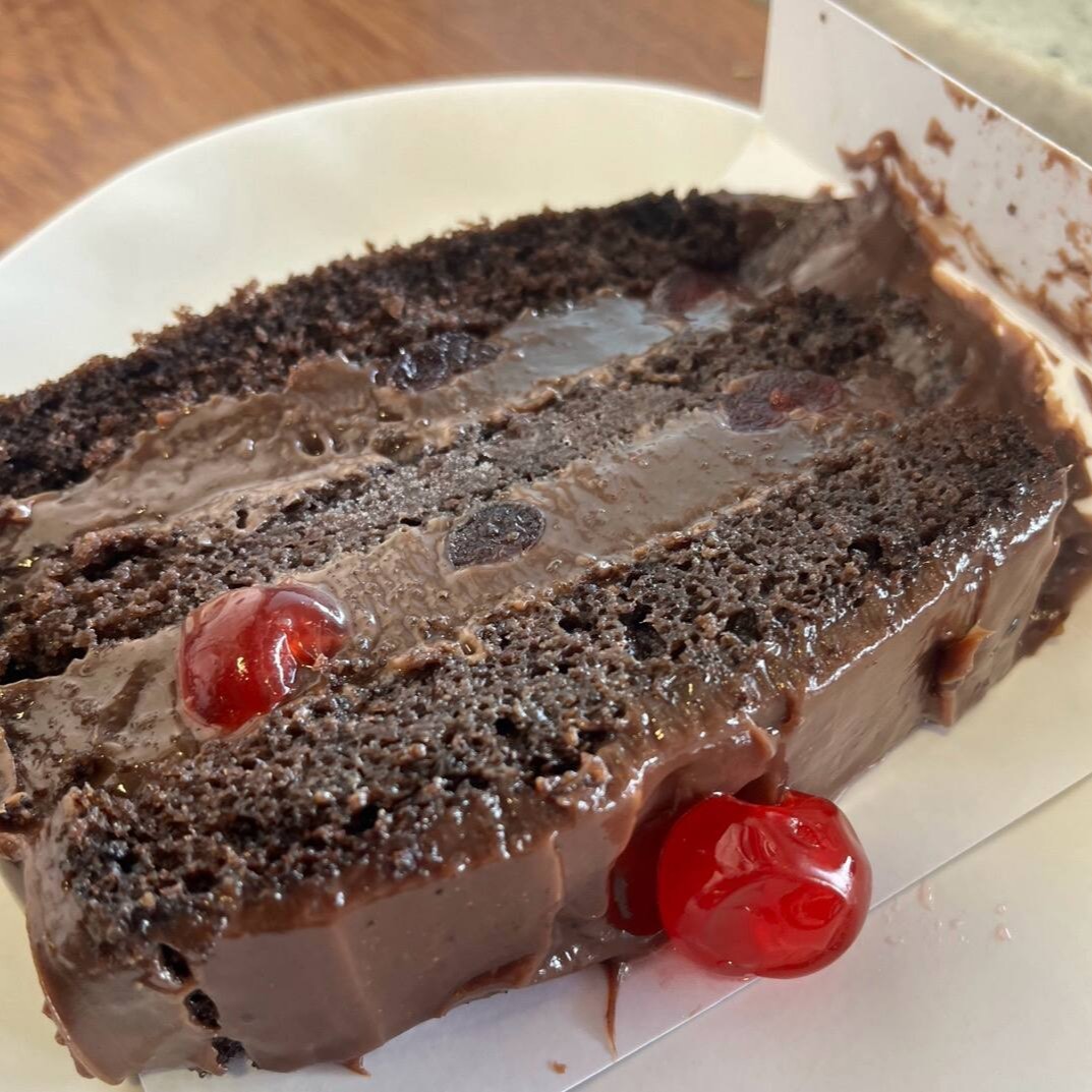 Massa de cacau molhadinha, brigadeiro de panela e cereja marasquino.