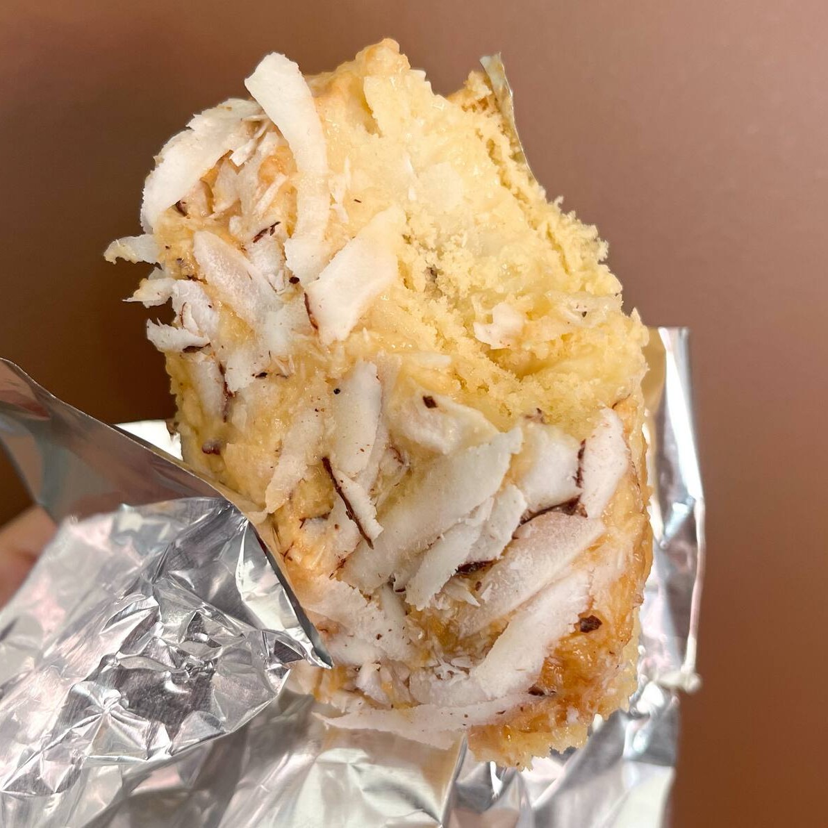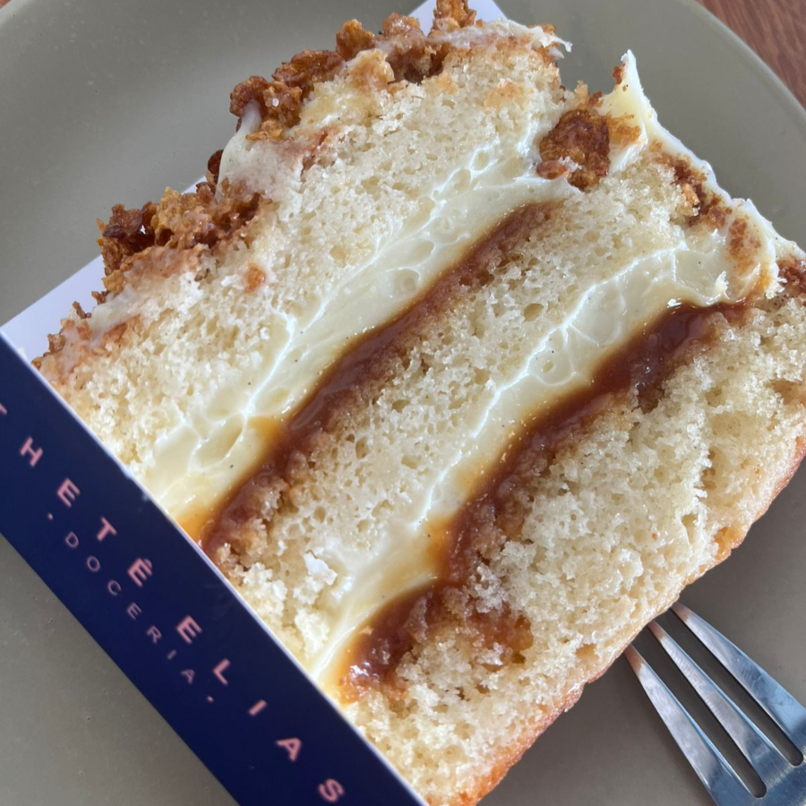 Massa de baunilha molhadinha, brigadeiro branco e coco fresco.