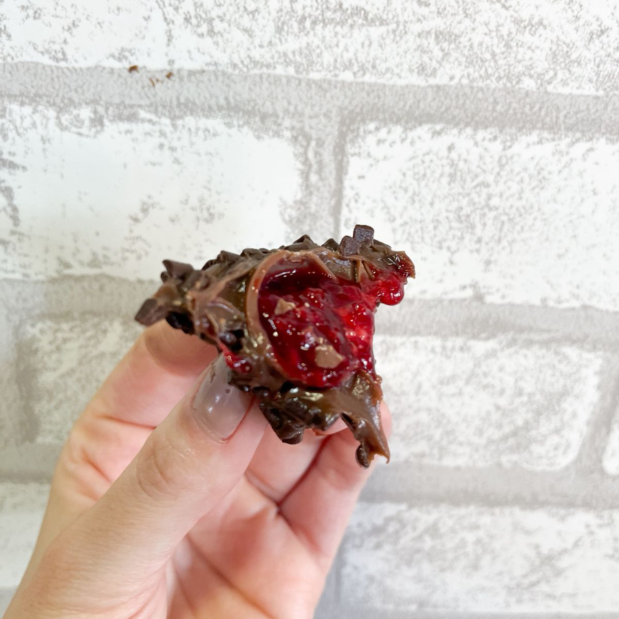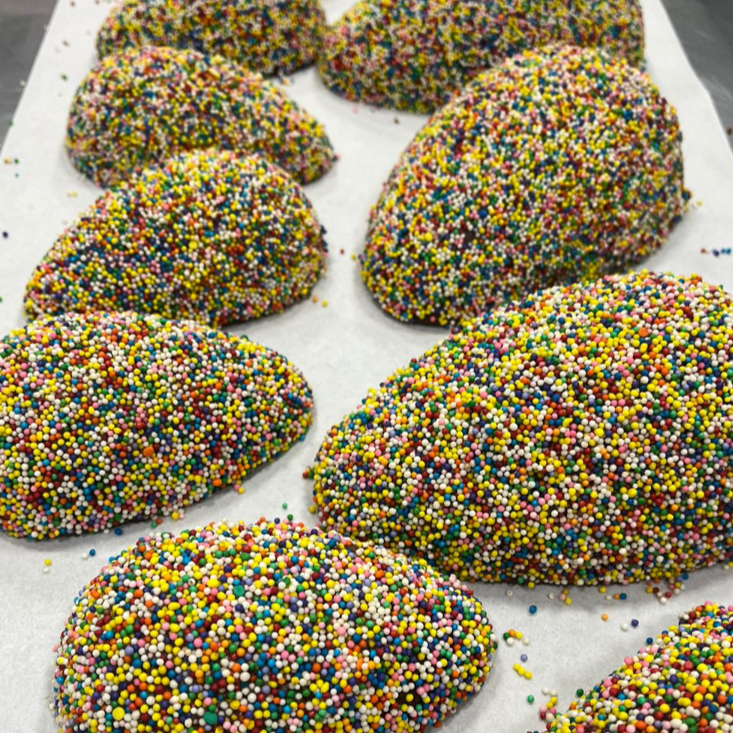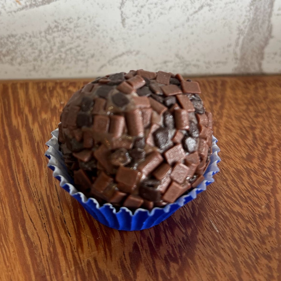 220 g de casca de chocolate blend, coberto com granulado colorido, rechedao com brigadeiro de panela.