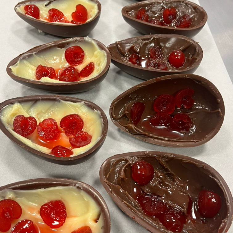 220 g de chocolate blend, brigadeiro branco e tradicional e cereja marasquina.