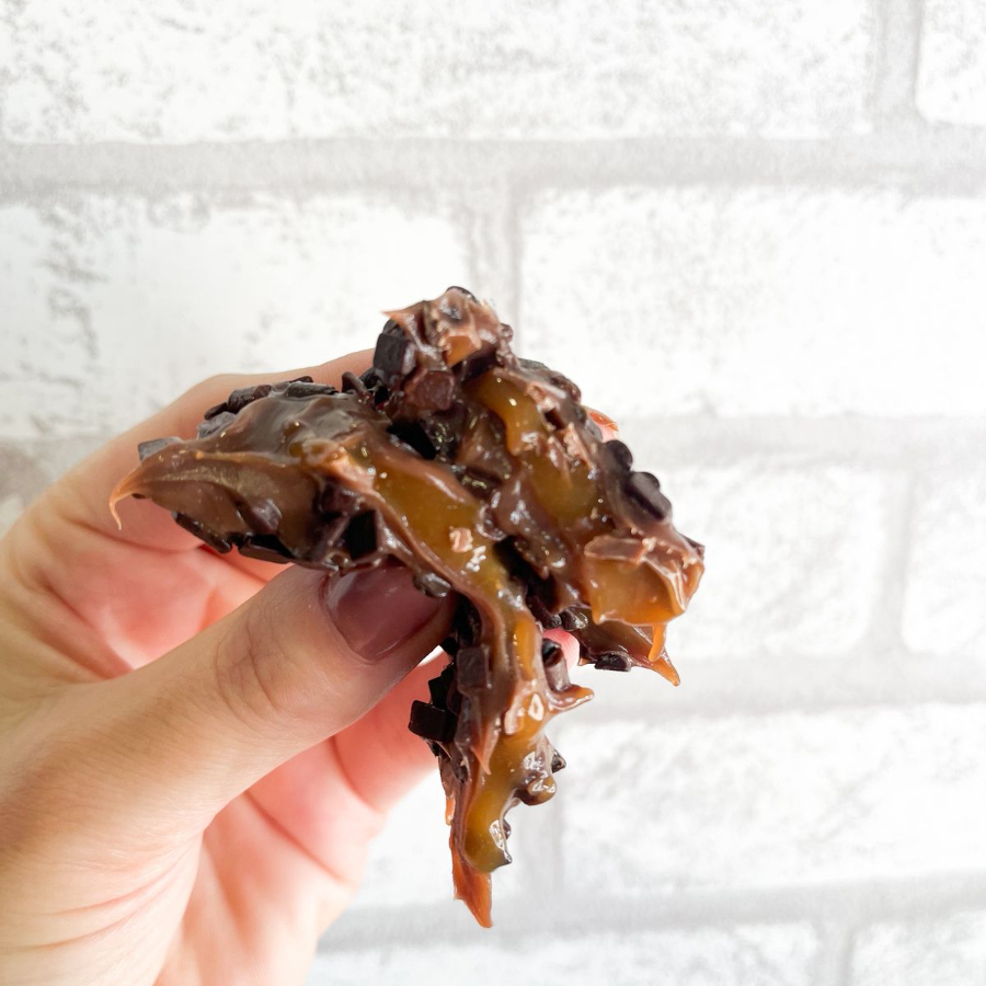 220 g de chocolate blend, caramelo salgado e biscoito amanteigado.