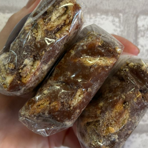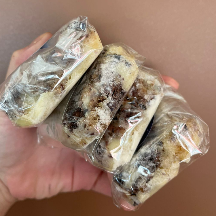 80 g de massa amanteigada de baunilha, recheada com brigadeiro de camafeu de nozes.