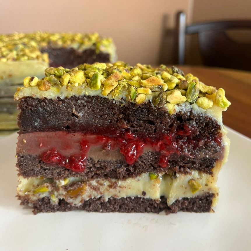 240 gramas de massa de cacau molhadinha, brigadeiro de panela e calda de framboesa e brigadeiro de pistache.