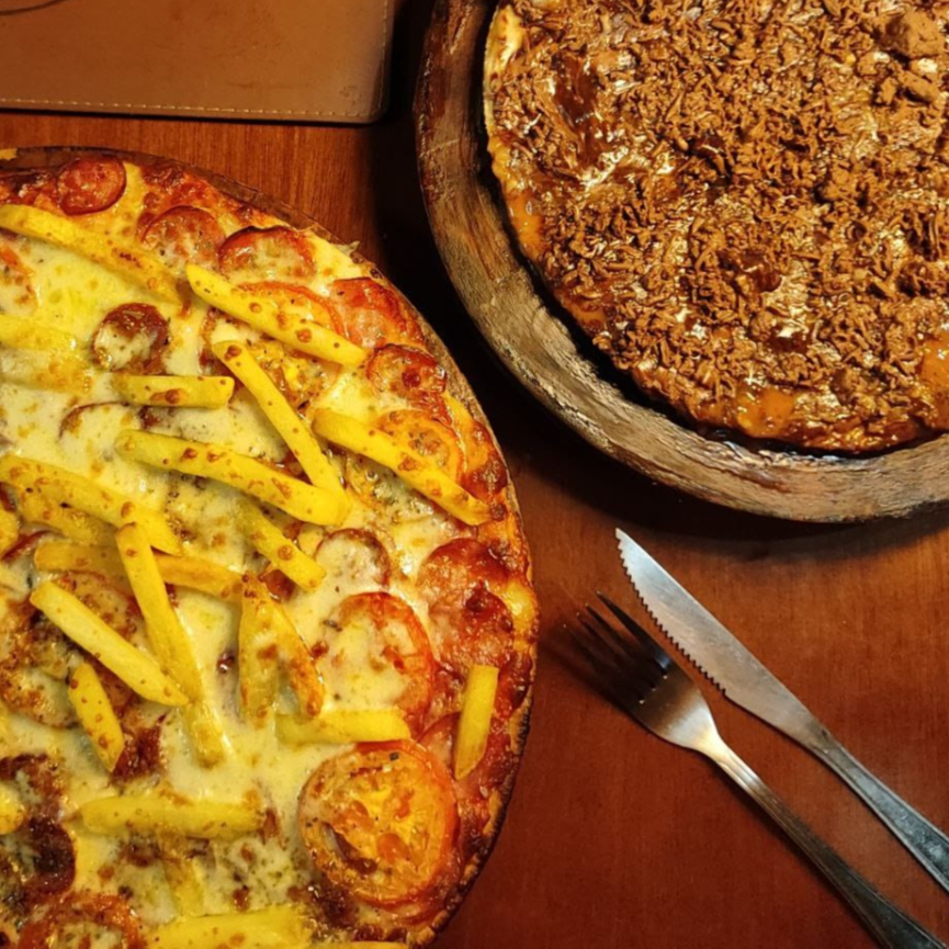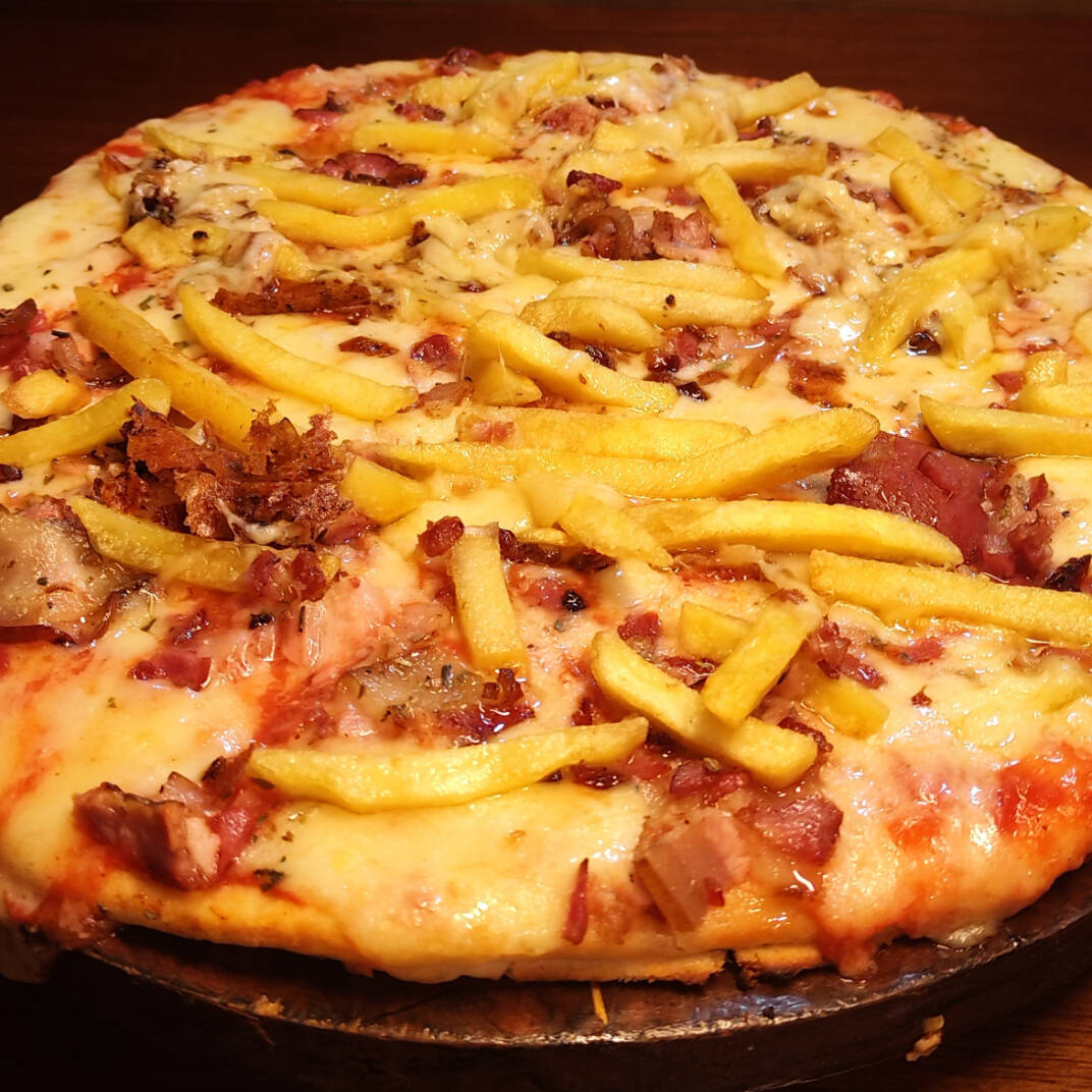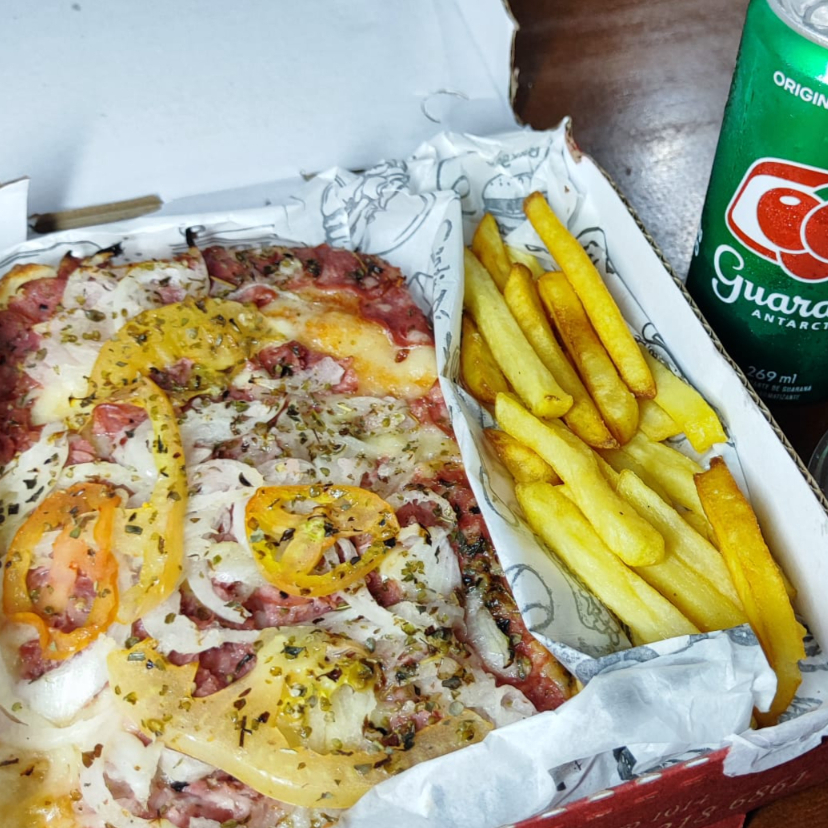 molho de tomate, mussarela, calabresa, fritas