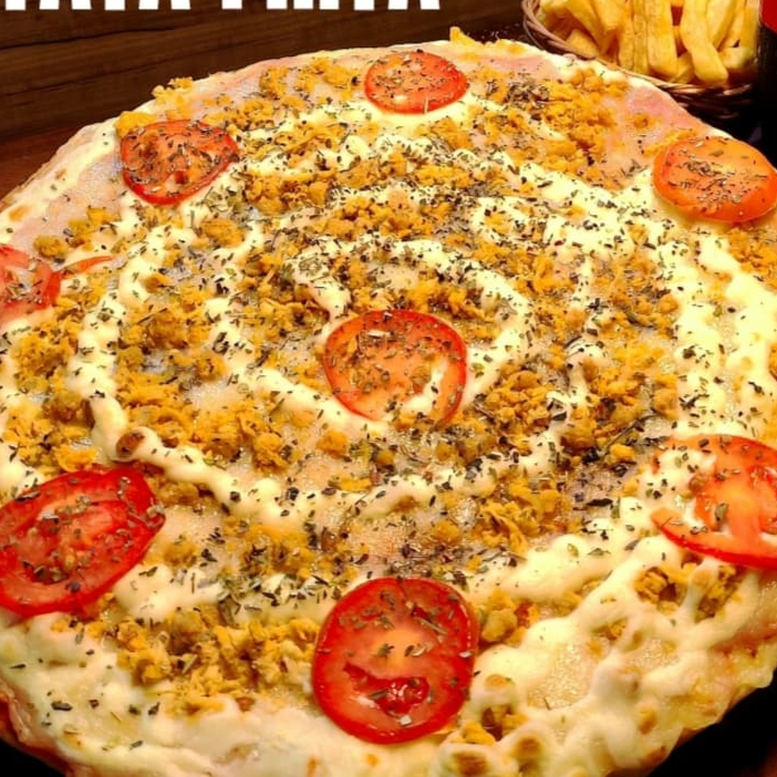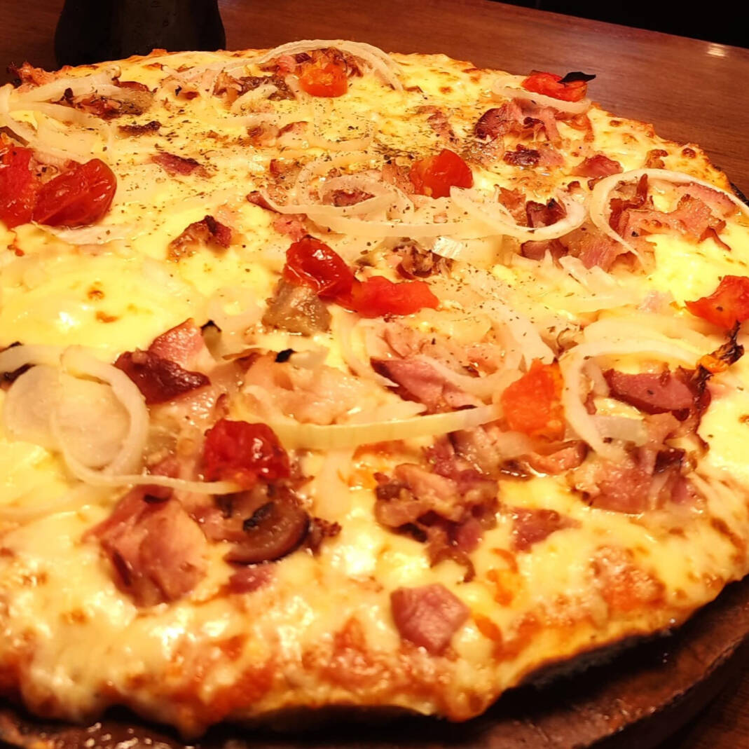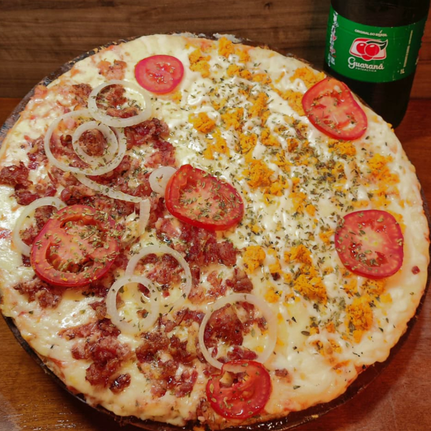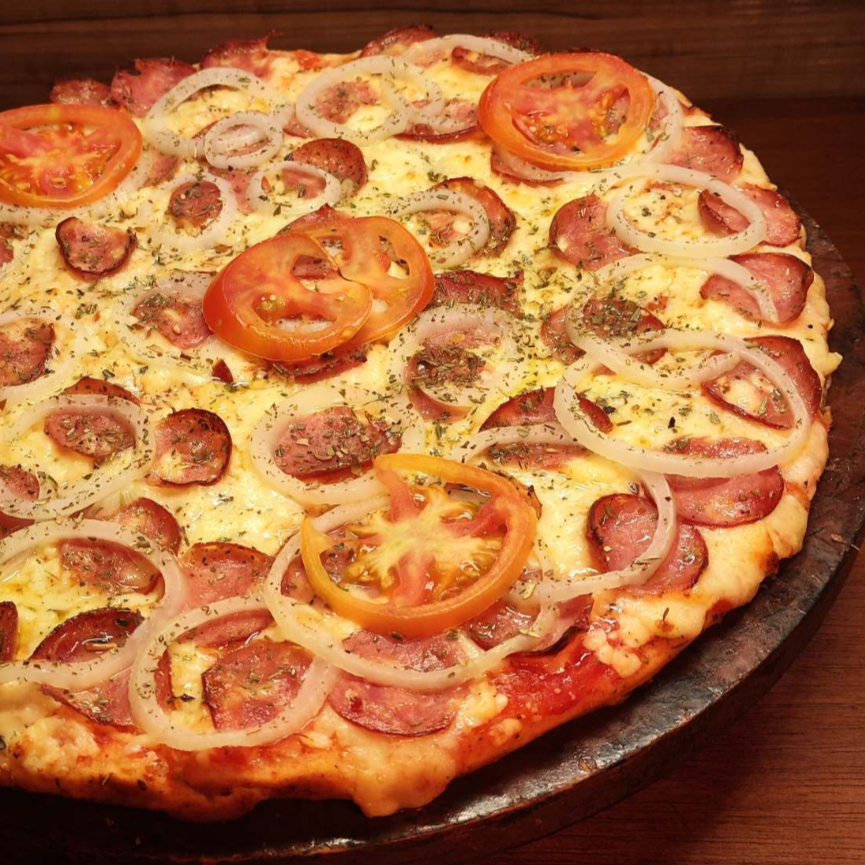 molho de tomate mussarela, bacon, cebola tomate e oregano