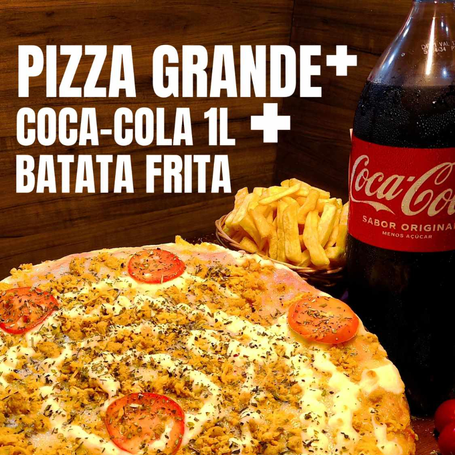 pizza de frango com catupiri grande de 35 cm + coca de 1 litro + Batata frita