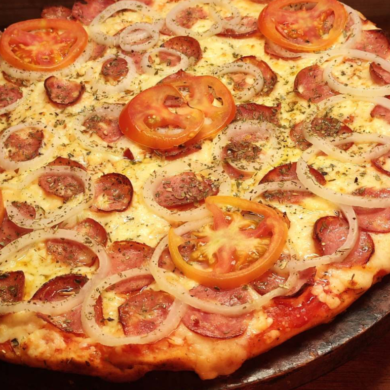 molho de tomate, mussarela, calabresa, cebola, tomate e oregano.