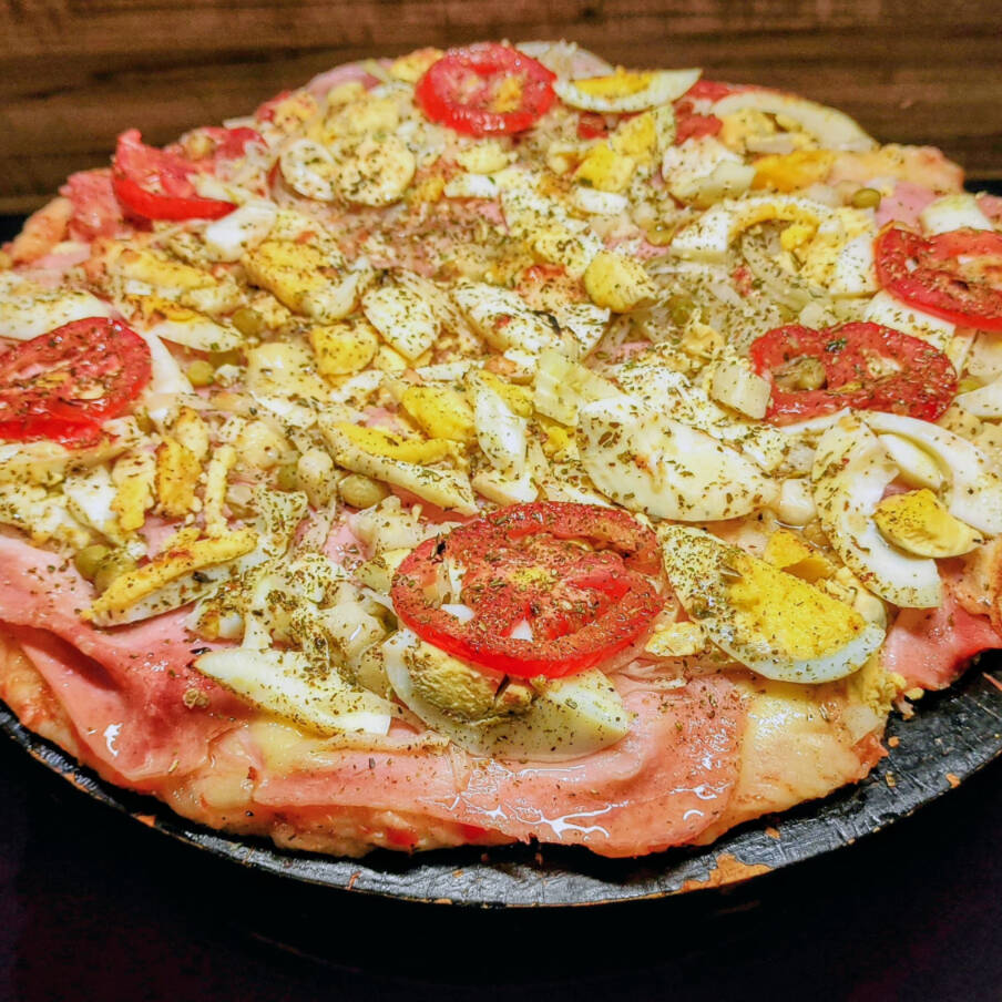 pizza 30 cm 6 fatias, molho de tomate, mussarela, presunto, ovo, ervilha, tomate e oregano